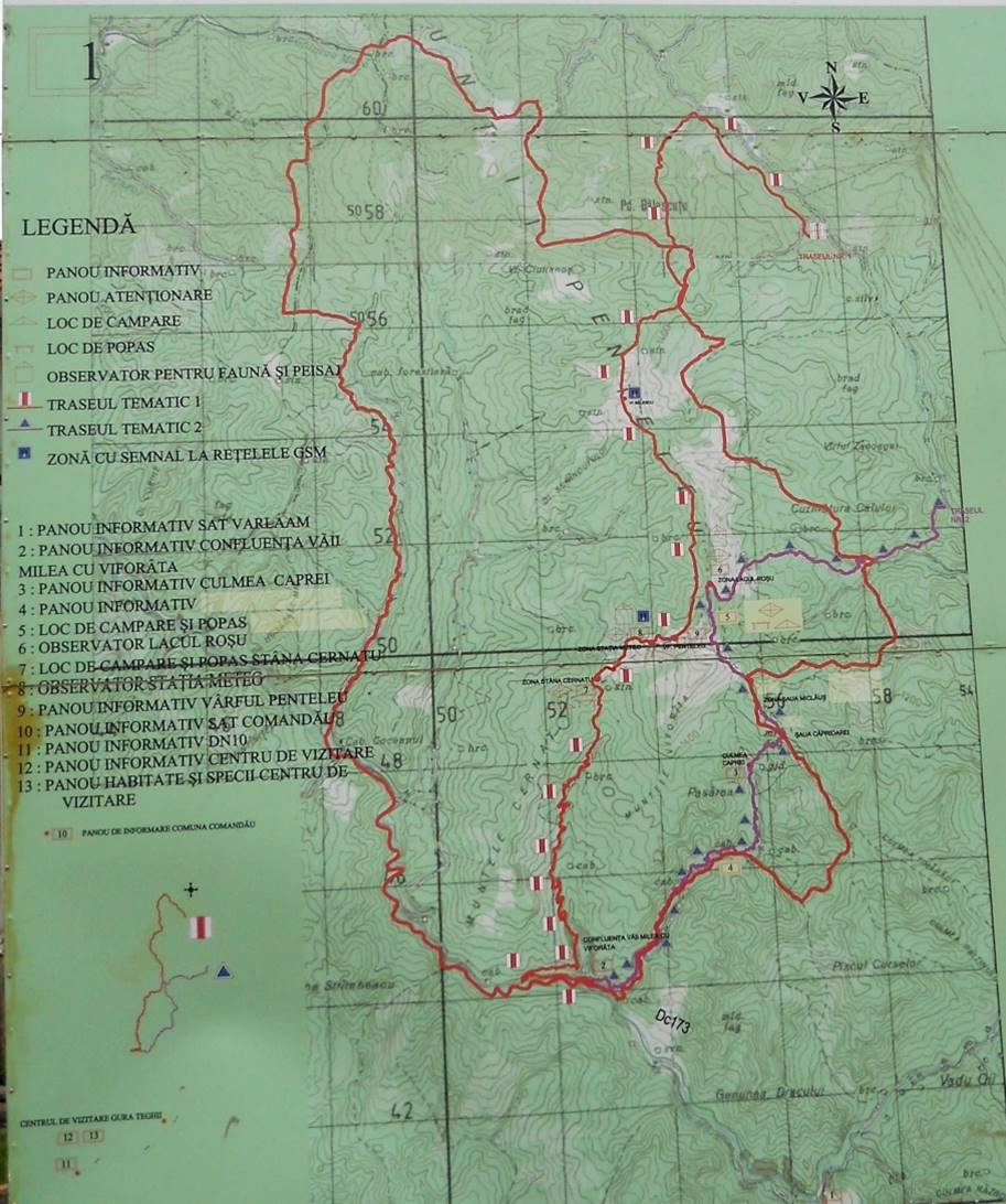 3. Ca să terminăm cu hărțile de pe panourile orientative din Varlaam și Gura Cernatului să facem puțin referire la două marcaje noi (“realizate” înainte de 2013) ce pleacă din Varlaam, din același punct, o “bandă albastră” și un “punct roșu”. Din cele scrise/povestite de Ioan Stoienică în 2011–2015 rezultă că marcarea, cel puțin a primului, a fost abandonată încă din … fașă; cel mai bine este să nu fie luate în considerare !