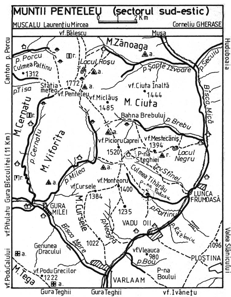 la fel apare prezentat traseul și pe o hartă publicată în 1992 (Muscalu Laurențiu Mircea & Corneliu Gherase). Pe teren, cel puțin de sub Vârful Piciorul Caprei (versantul sudic) până în Șaua Căprioarei poteca este foarte bună și încă marcată – sporadic și șters – cu semnele “triunghiului albastru”. Cum spuneam, din Șaua Căprioarei, marcajul a fost refăcut în 1992; ne-a fost ușor să-l urmărim până la ieșirea la Golul Miclăușului, sector în care, foarte rar, apar doi-trei stâlpi indicatori. Zona este dificilă iarna și, mai ales, în caz de ceață, “golul” fiind și acoperit casiintegral cu tufe de ienupăr și pâcuri de molizi – deja mărișori ! De asemenea, este dificil de reperat poteca și deci continuarea traseului din Golul Miclăușului (mai precis, din Șaua Cășeria) prin zona joasă a obârșiei celor Șapte Izvoare; ca și invers, dinspre Lacu Roșu spre Golul Miclăușului, căci poteca cândva/încă pastorală străbate porțiuni cucerite de ienuperi și molizi pitici, pe unde e mai greu de decelat, semnele marcajului fiind și extrem de rare ! În fine, am citit ici-colo pe NET cum că semne ale triunghiului albastru duc și în afara traseului, de pe versantul stâng al văii Șapte Izvoare, din preajma Lacului Roșu, până pe/sub Vârful Penteleu.