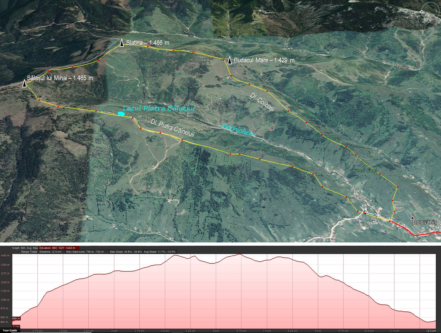 Traseu: Petricheni – Dl. Piatra Câinelui – Vf. Sălașul lui Mihai – Vf. Slatina – Vf. Budacul Mare – Dl. Colibași – Petricheni