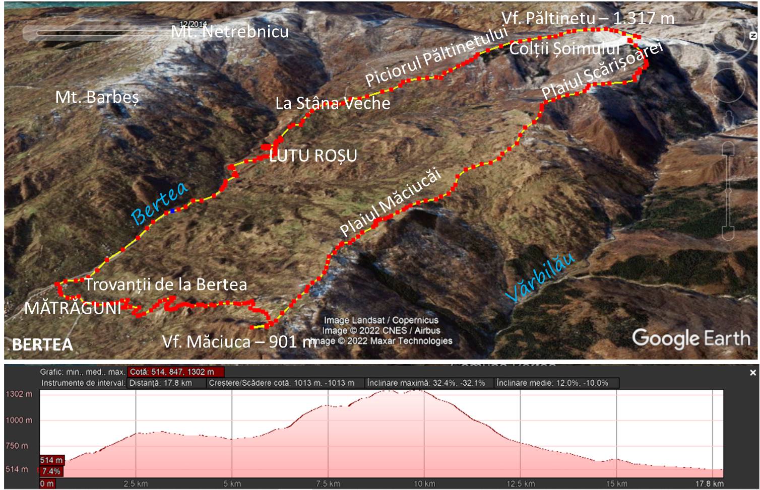 Traseu: BERTEA/PH – Trovații de la Bertea – Vf. Măciuca – Plaiul Măciucăi – Plaiul Scărițoarei – Colții Moșnenilor – Vf. Păltinetu – Piciorul Păltinetului – Lutu Roșu – BERTEA