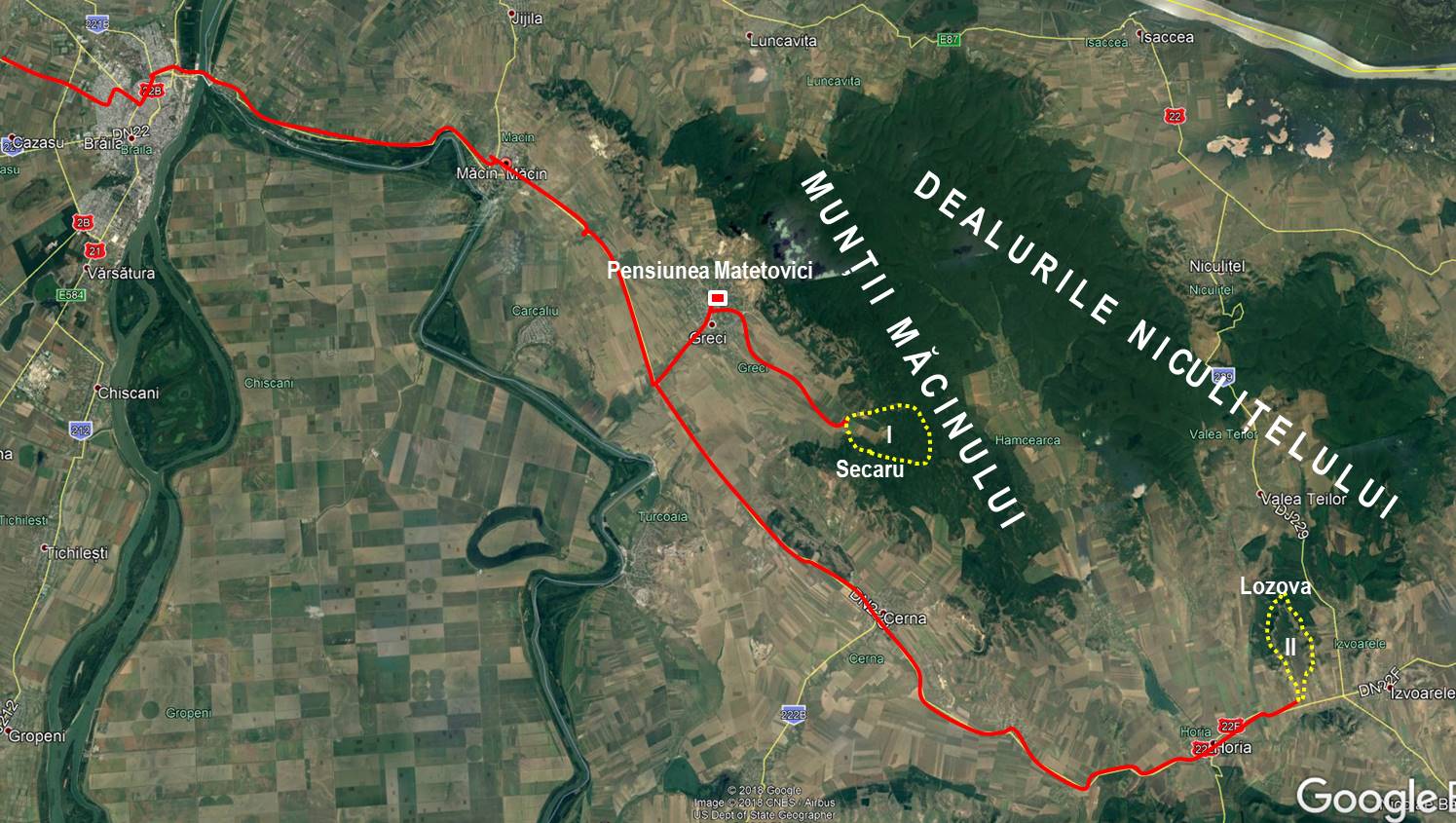 Ziua 1: Onești – Brăila – Smârdan – Măcin – Greci – Golful Cozluc – Cheile Chediului – Confluența Burlacu-Otulu – Dl. Ioaneșu – Vf. Știubeilor – Vf. Teica – Dl. Secaru – Golful Cozluc – Greci (Pensiunea Matetovici)