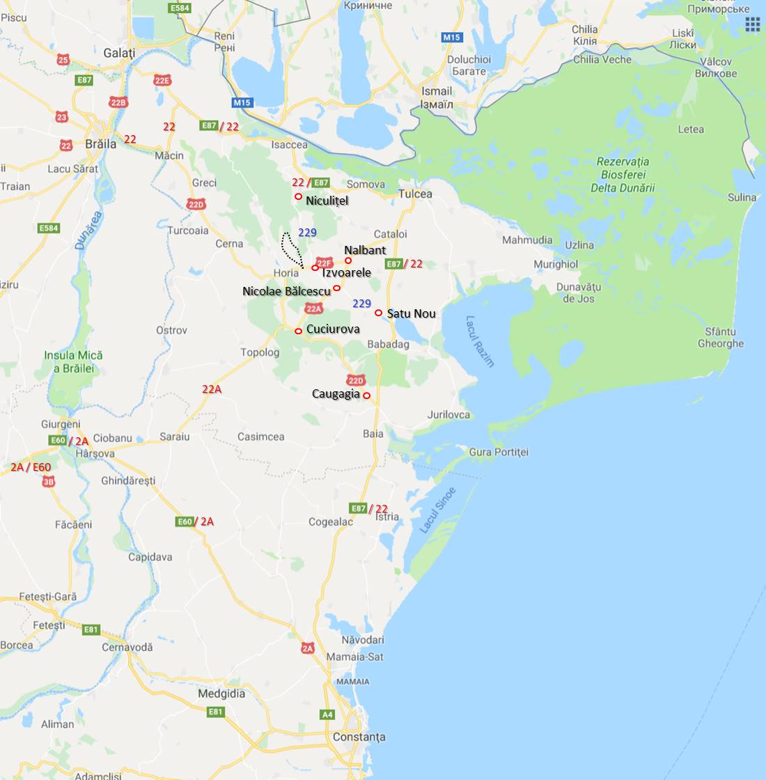 Obs. DN 22 unește localitățile Ovidiu/Constanța – Tulcea – Măcin – Smârdan -bac- Brăila – Râmnicu Sărat
