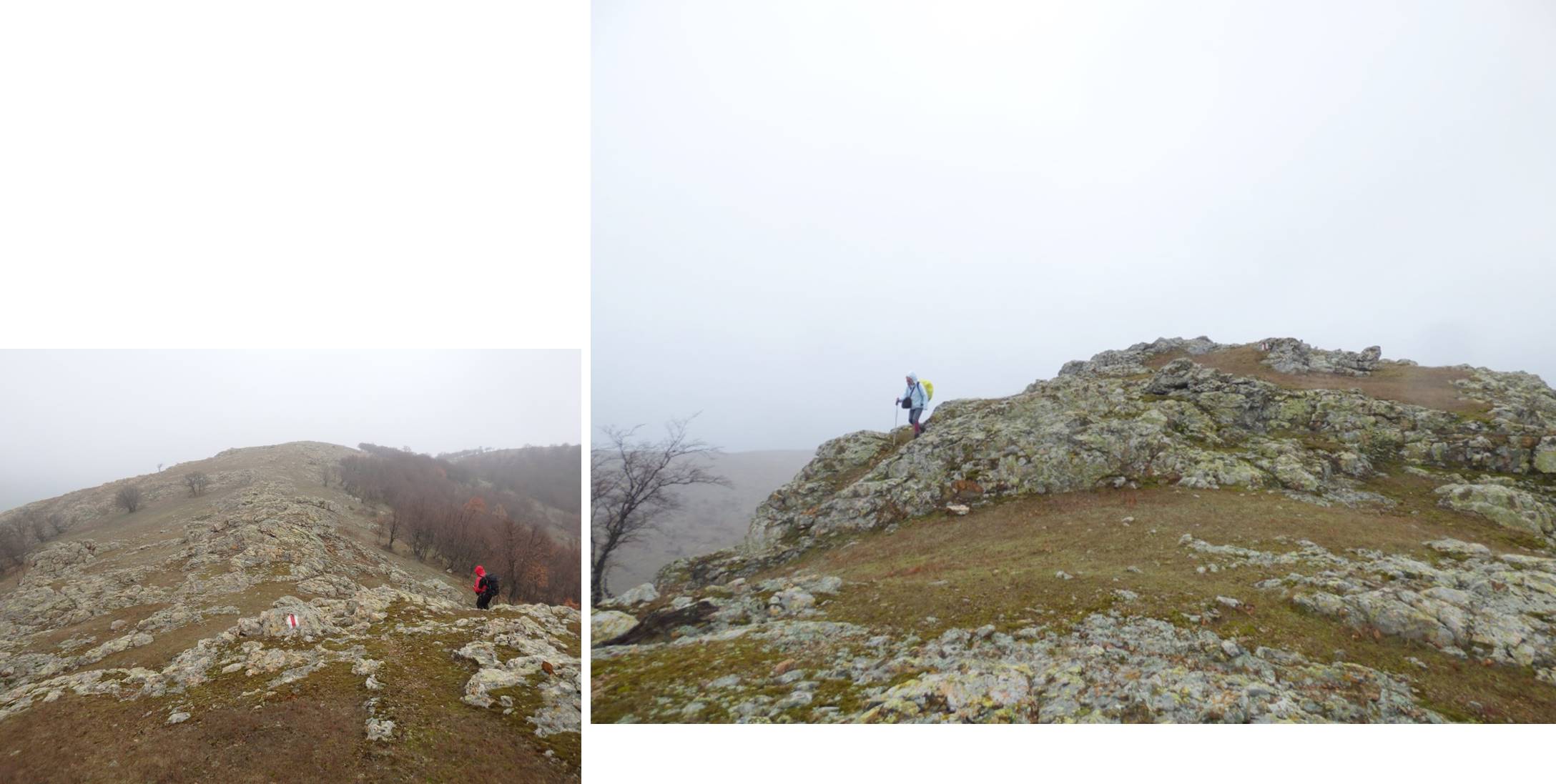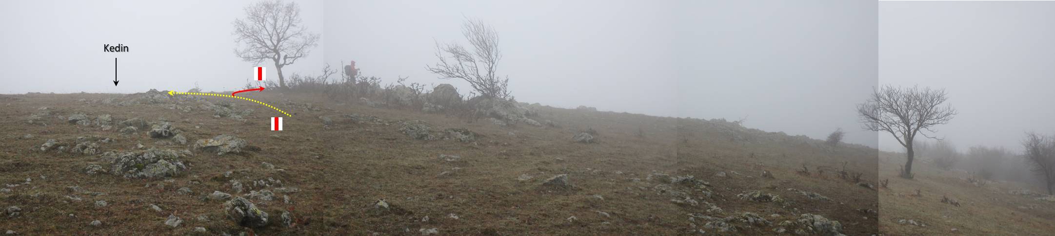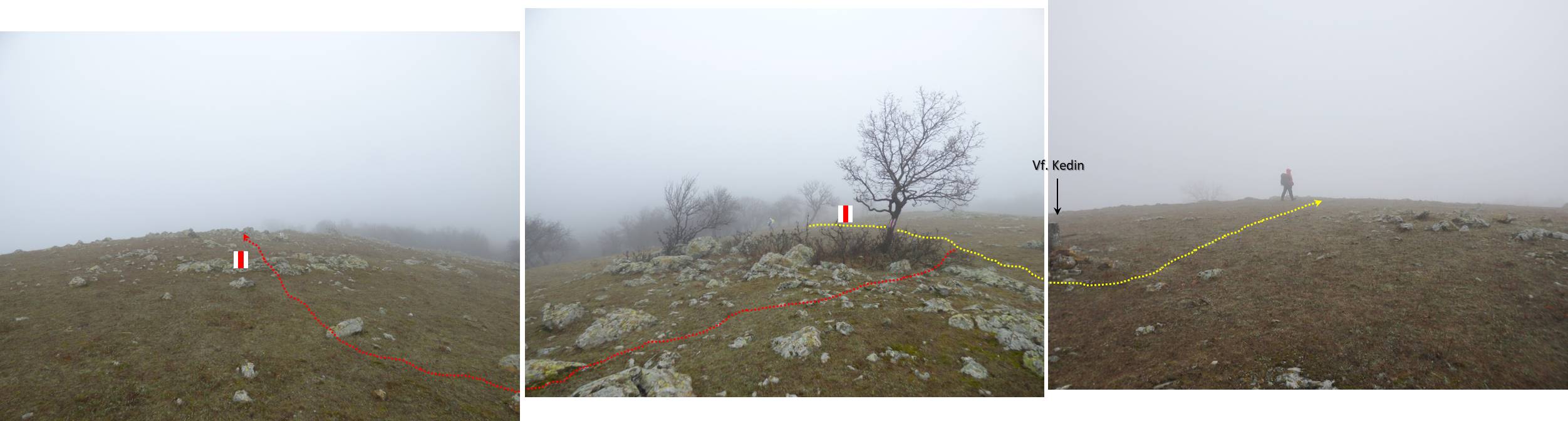 … care ne oferă o nouă perspectivă asupra împrejurimilor; apar semnele – benzi roșii – ale unui traseu turistic – despre care nu am reușit să aflăm decât informații contradictorii -, …