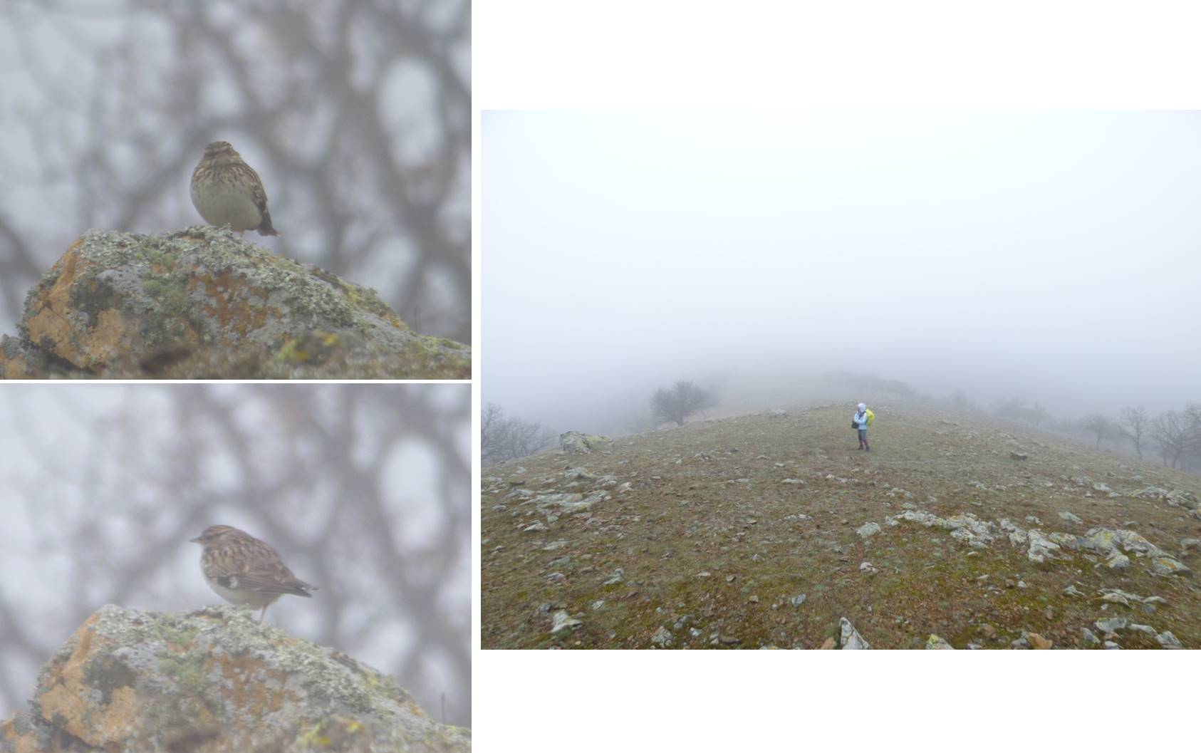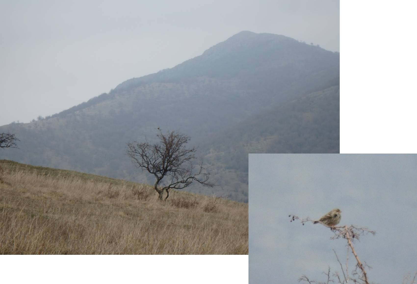 Cenușiul … ceții transcende: ne atrage atenția un cânepar (Carduelis cannabina) – o rudă apropiată a sticletelui – … femelă, distinctă de mascul (cu un frumos plastron roșiatic) prin coloritul ei, uniform, … cenușiu (a se citi … cafeniu) !
