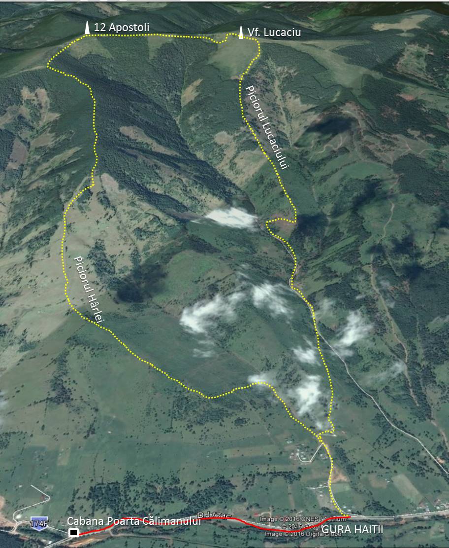 Traseu: Gura Jidanului – Pârâul cu Pește – Piciorul Lucaciului – Vf. Lucaciu – La 12 Apostoli – Piciorul Hârlei – Valea Jidanului – Gura Jidanului