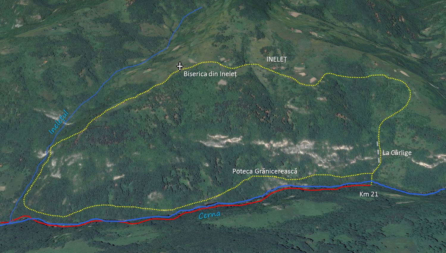 Traseu: km 22 – Scările La Cârlige – Satul Ineleț [biserica] – Valea Inelețului – Poteca Grănicerească – km 22