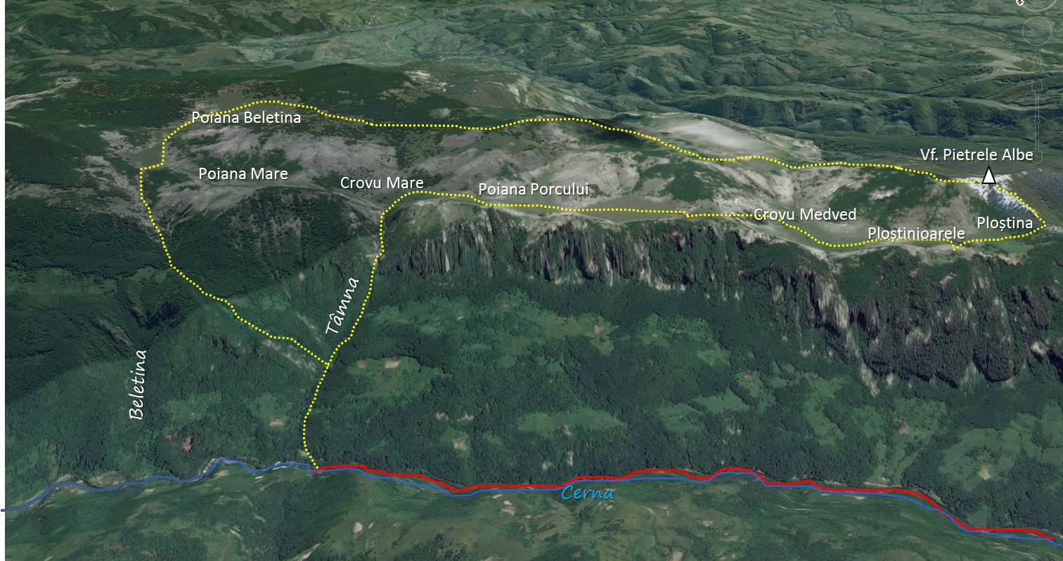 Traseu: Gura Tâmnei – Cheile Tâmnei – Crovu Mare – Poiana Porcului – Poiana Medves – Ploștinioarele – Ploștina – Vf. Pietrele Albe – Poiana Beletina – Gura Tâmnei