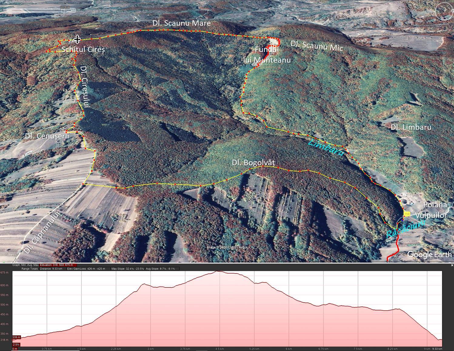Traseu II: FUNDU RACACIUNI (Gura P. Limbaru) – Valea Limbarului – Alunecarea de la Fundu lui Mocanu – Dl. Scaunul Mic – Dl. Scaunul Mare – Schitul Cireșu – Dl. Cireșului – Dl. Cenușerei – Dl. Bogolvăț – Gura Limbarului