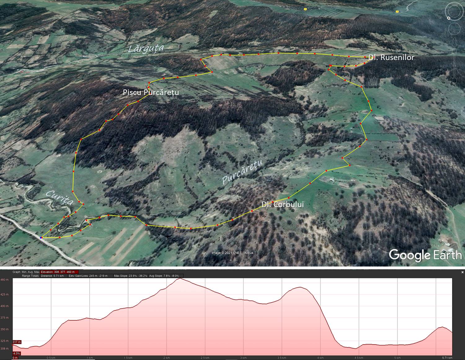 Traseu: CURIȚA (Gura Purcărețului) – Piscu Purcărețu – Dl. Rusenilor – Dl. Corbului – Gura Purcărețului