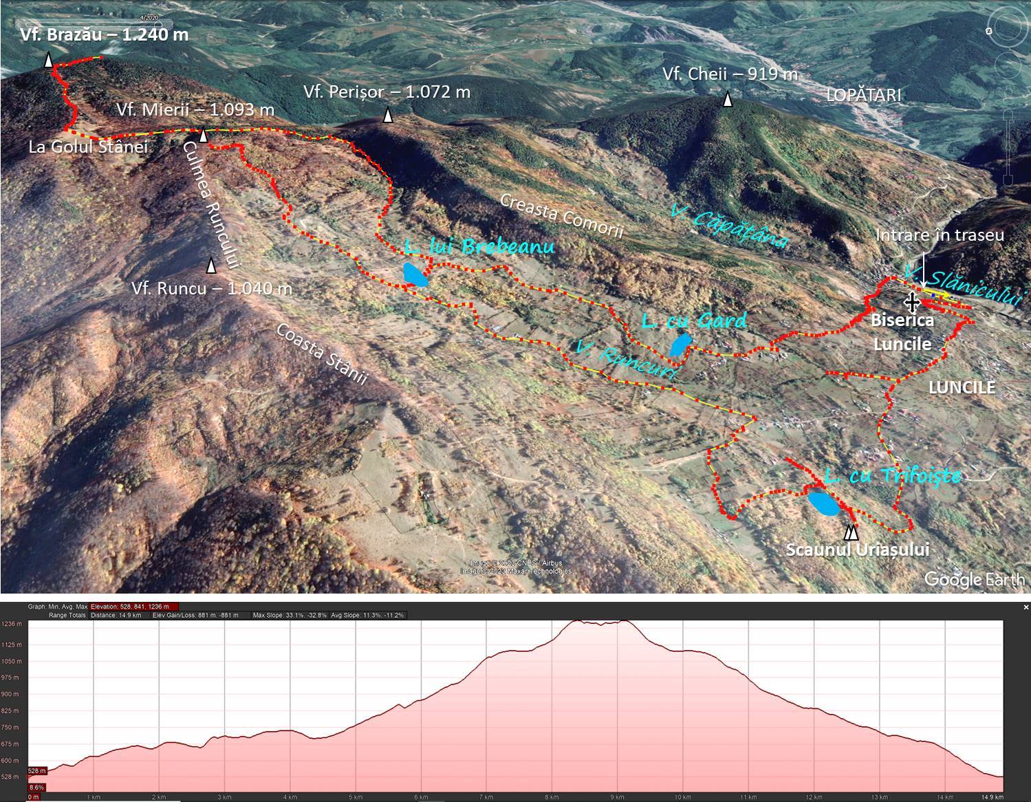 Traseu I: LUNCILE/LOPĂTARI (Gura Căpățânii) – Biserica Luncile – Lacul cu Trifoiște – Valea Runcuri – Lacul lui Brebeanu – Vârful Mierii – Lacul lui Brebeanu – Lacul cu Gard – Gura Căpățânii
