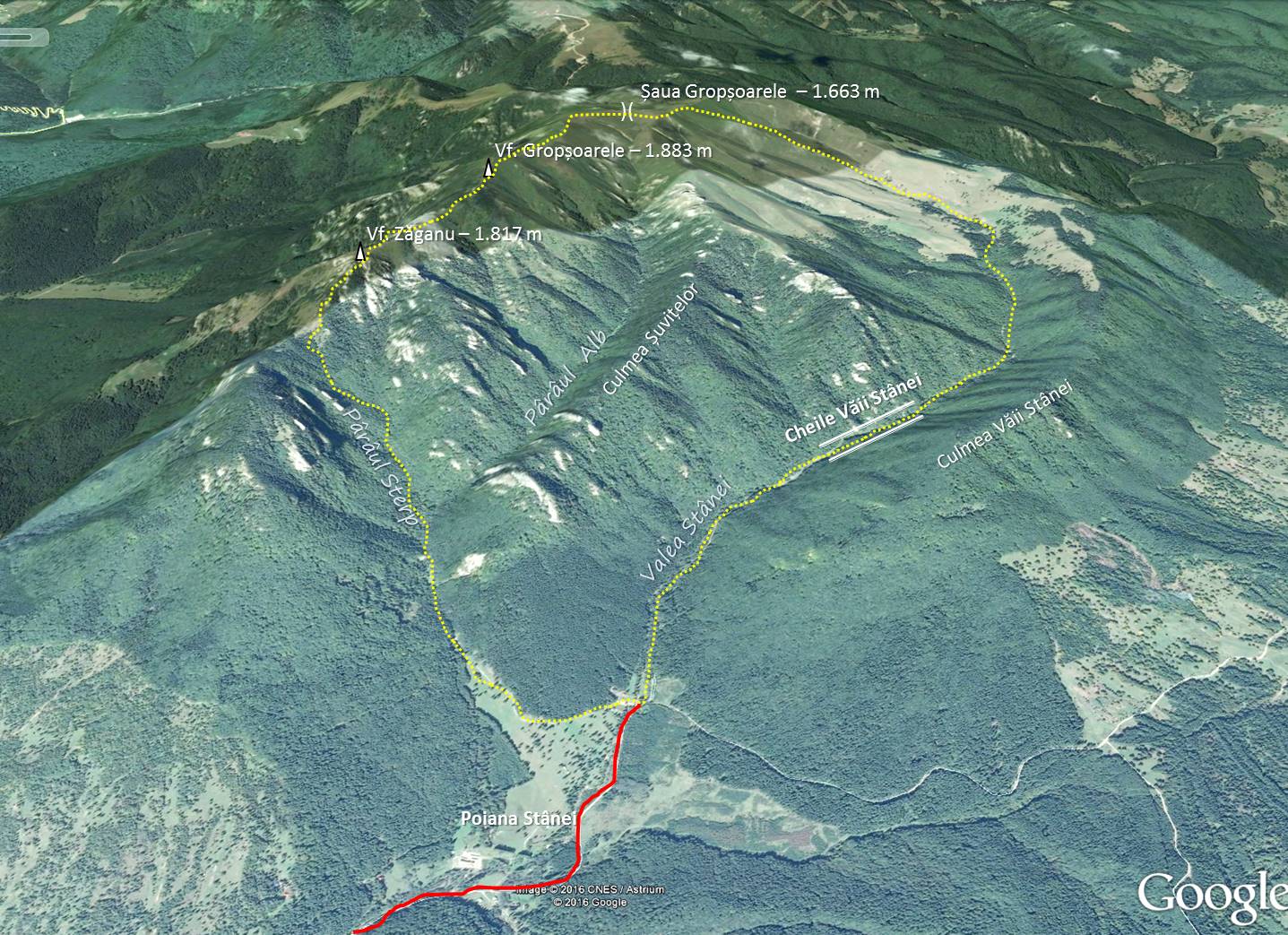 Traseu: [Onești – Săcele – Cheia – Poiana Stânei (auto – cca 180 km)] Poiana Stânei – Valea Stânei [Cheile Văii Stânei] – Șaua Gropșoarele – Vf. Gropșoarele – Vf. Zăganu – Pârâul Sterpu – Poiana Stânei [- Cheia (auto – cca 19 km); cazare Cheia – Pensiunea Carmen]