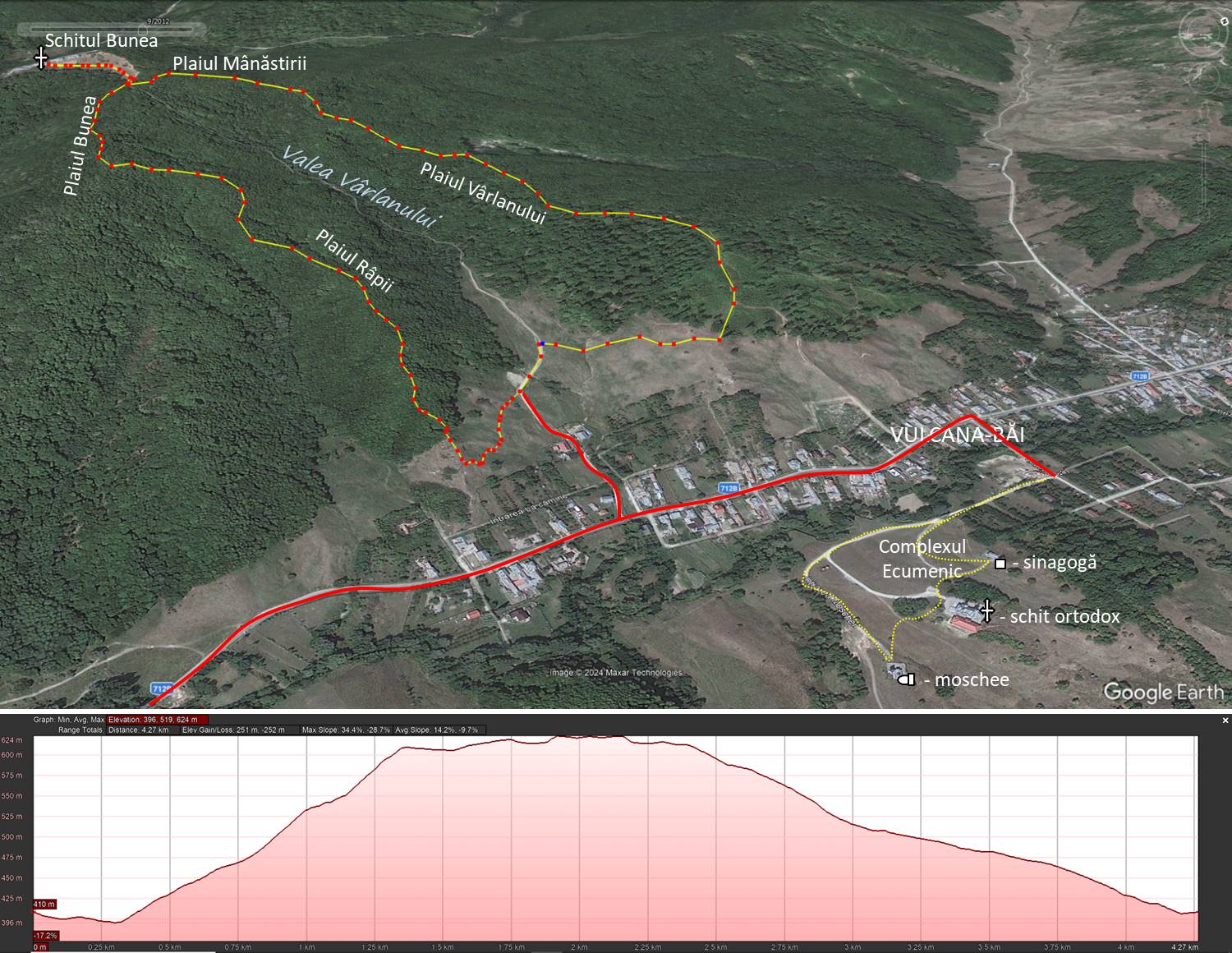 – traseu drumeție: a) VULCANA-BĂI – Complexul Ecumenic