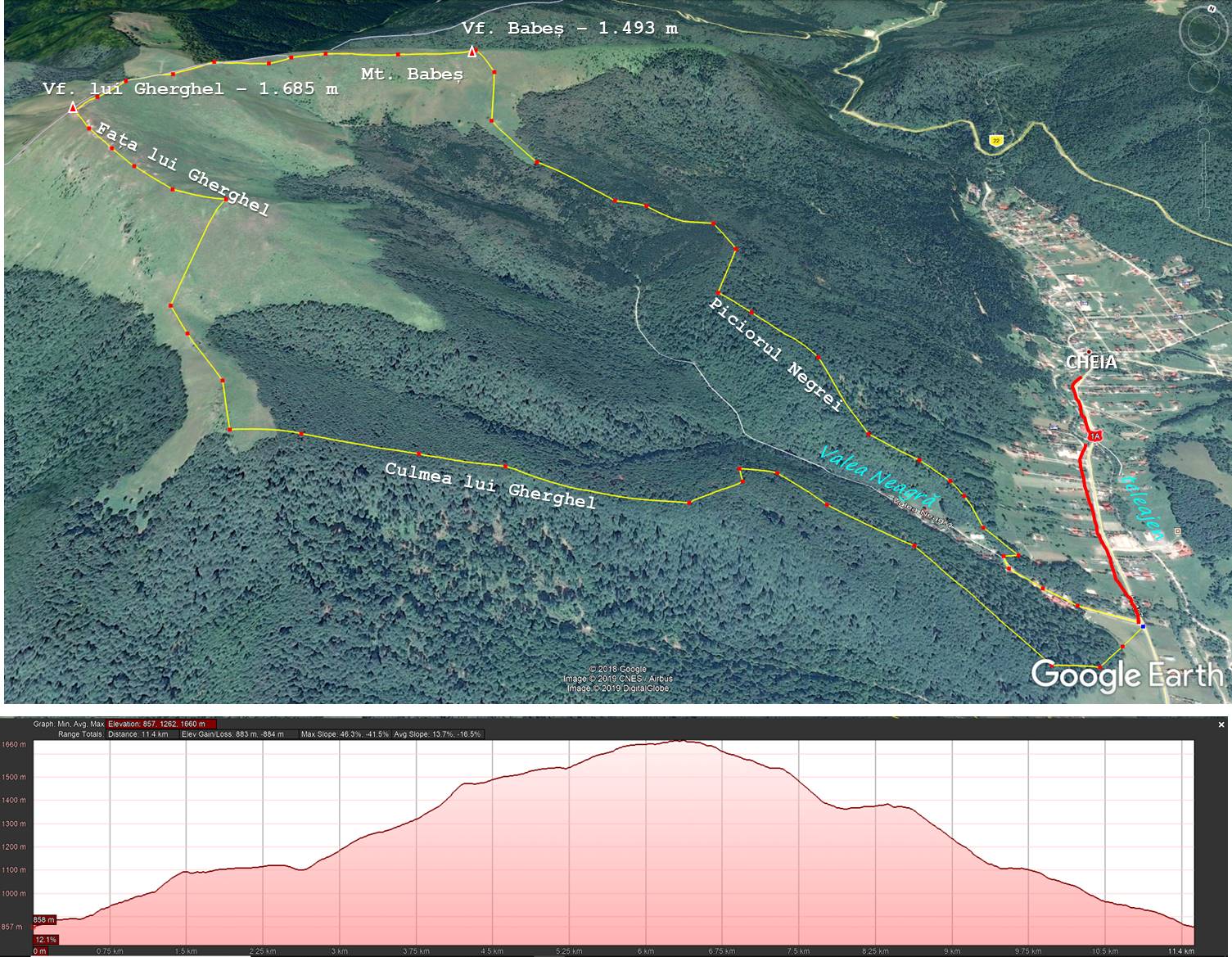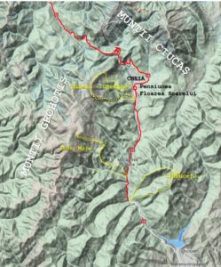 Traseu: Cheia (gura Văii Negre) – Piciorul Negrei – Vf. Babeș – Mt. Babeș – Vf. lui Gherghel – Mt. Fața lui Gherghel – Plaiul Gherghel – gura Văii Negre
