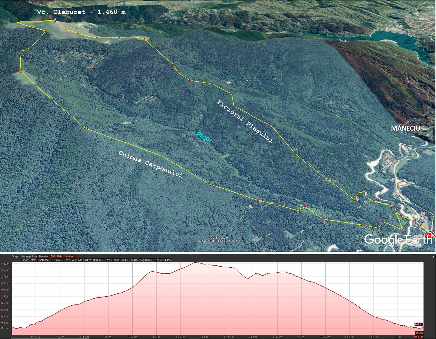 Traseu: Gura pârâului Pleșu – Piciorul Pleșului – Vf. Clăbucetu Mâneciului – Plaiul Carpenului – Gura Pleșului