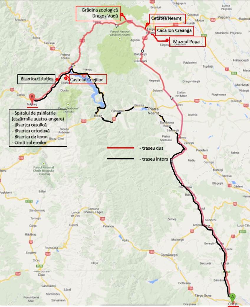 Traseu dus: Onești – Sănduleni – Ardeoani – Roznov – Girov – Bălțătești – Târgu Neamț (Casa memorială Ion Creangă, Cetatea Neamț) – Târpești/NT (Muzeul Popa) – Grădina zologică Dragoș Vodă – Ceahlău (Castelul Cnejilor, Mânăstirea Sf. Ana) – Tulgheș (Pensiunea Putna)