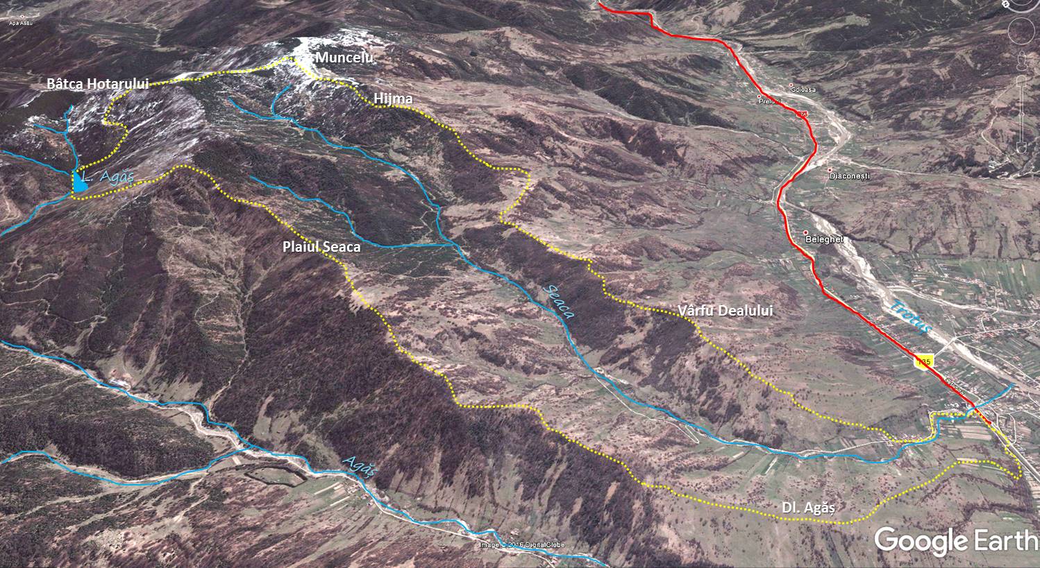 Traseu: Agăș – Dl. Agăș – Dl. Seaca – Lacul Agăș – Bâtca Hotarului – Mt. Muncel – Dl. Hijmei – Vârful Dealului – Agăș