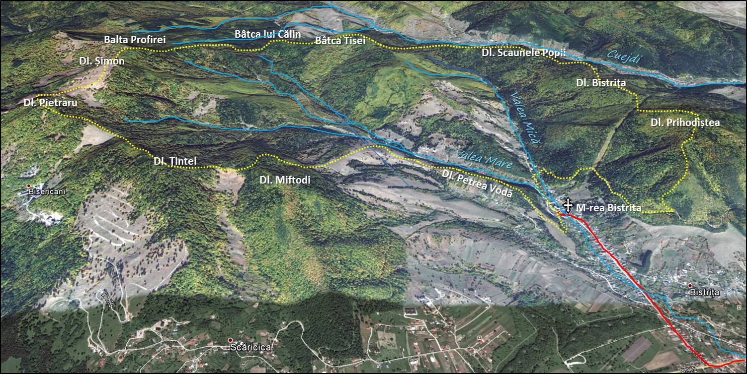 Traseu: M-rea Bistrița – Dl. Cetățuii [castrul roman] – Dl. Prihodiștea – Dl. Bistrița – Dl. Scaunele Popii – Bâtca Tisei – Bâtca lui Călin – Balta Profirei – Dl. Șimon – Dl. Țintei – Dl. Miftodi – M-rea Bistrița