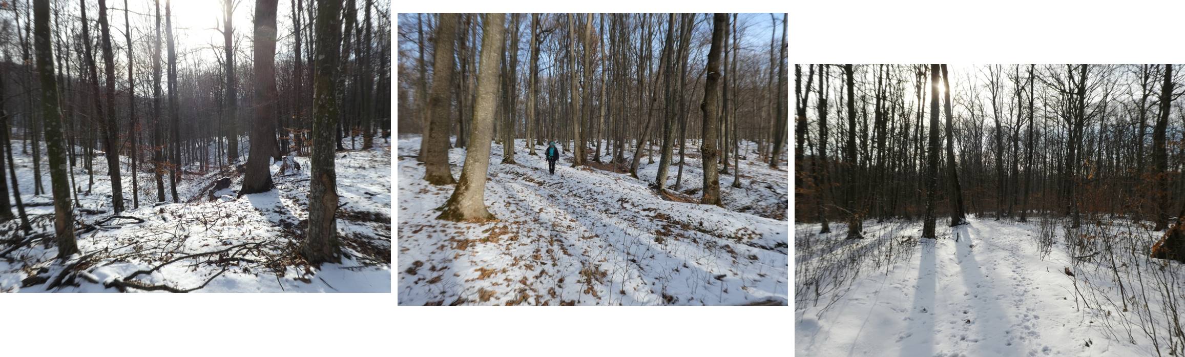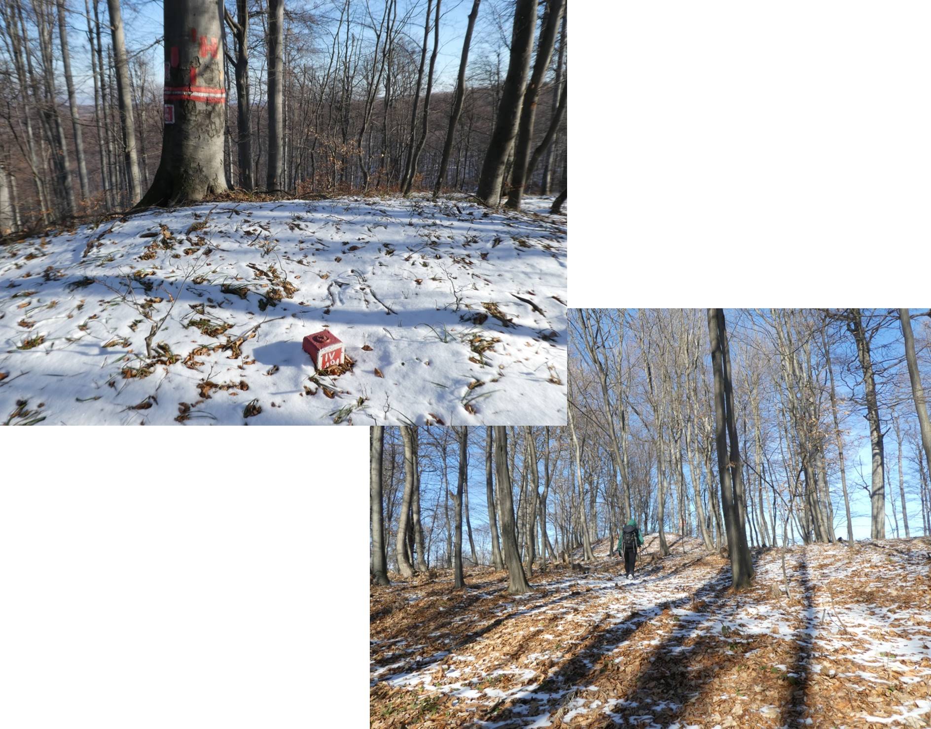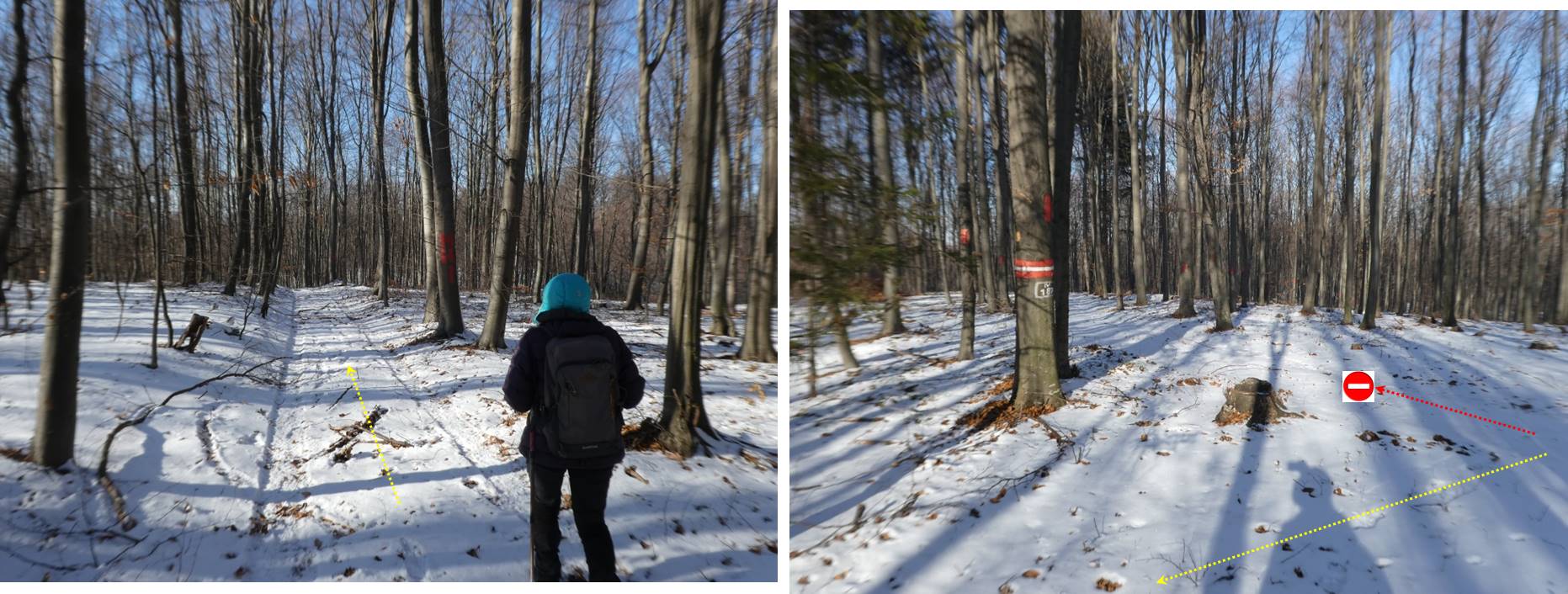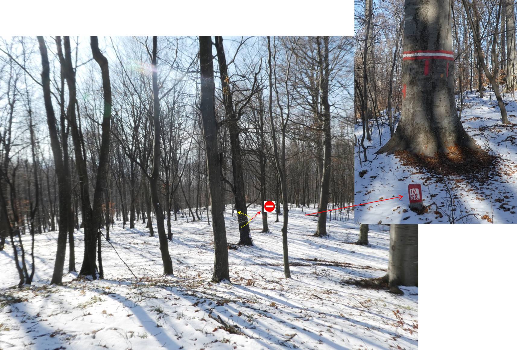 … vom schimba drastic direcția și marcajul silvic, renunâțând la “H”-uri – ce continuă spre vest pentru a coborî spre sud-vest după benzile roșii !