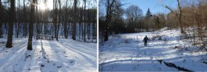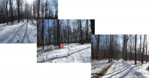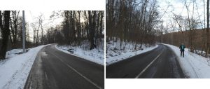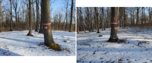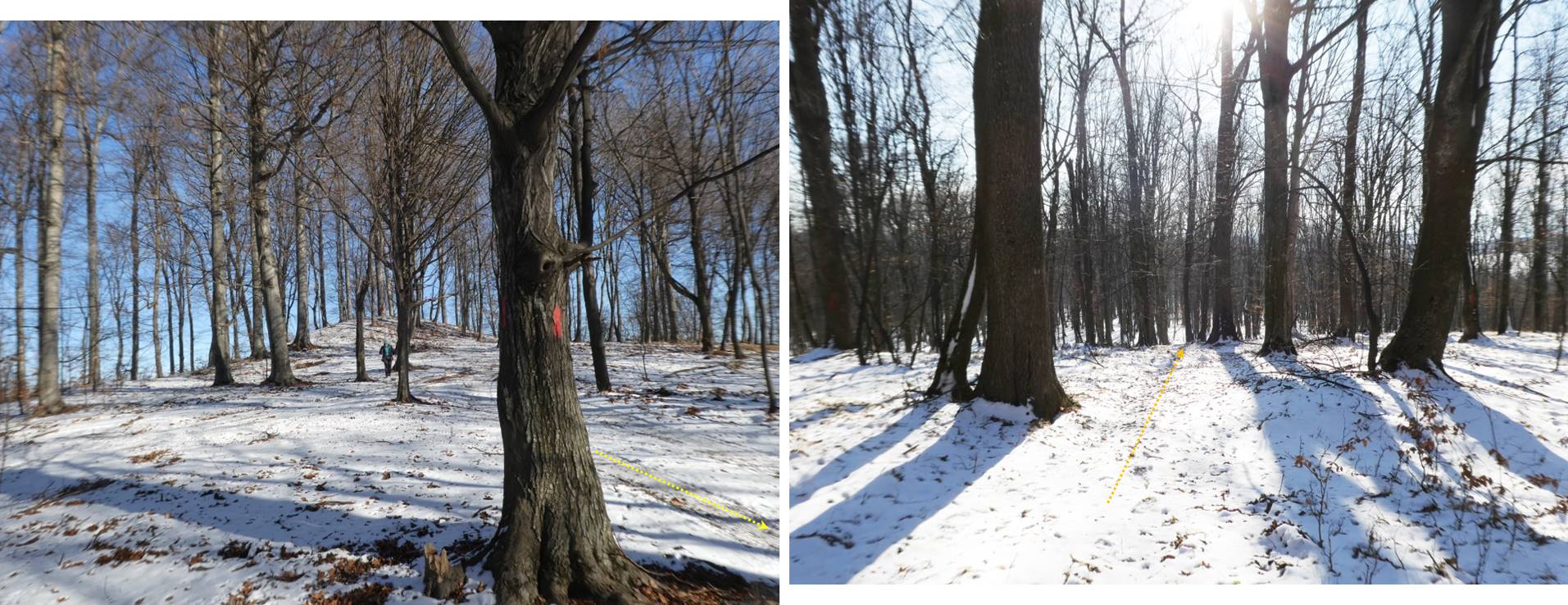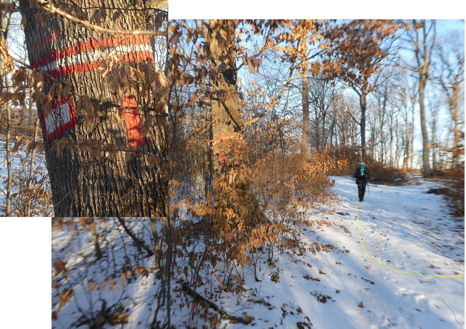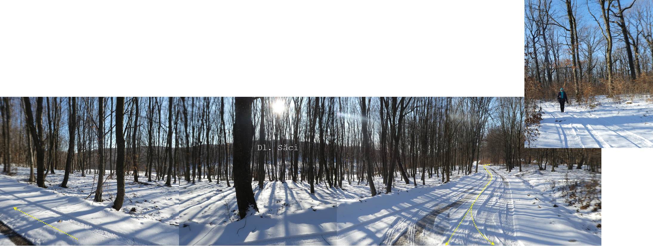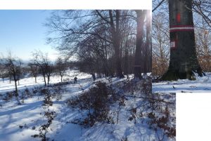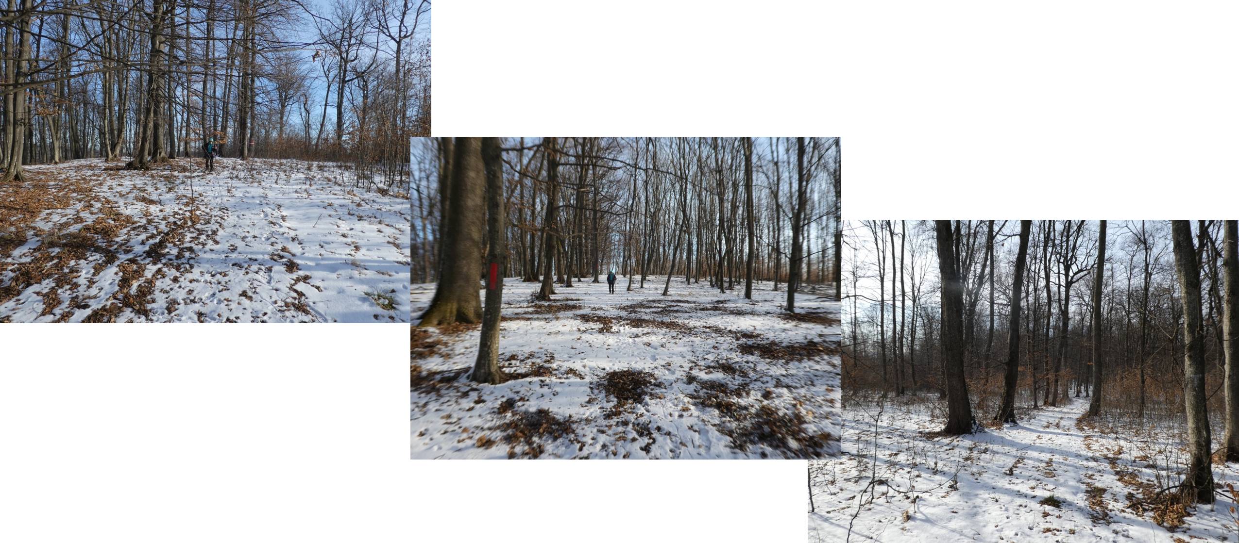 … vom schimba drastic direcția și marcajul silvic, renunâțând la “H”-uri – ce continuă spre vest pentru a coborî spre sud-vest după benzile roșii !