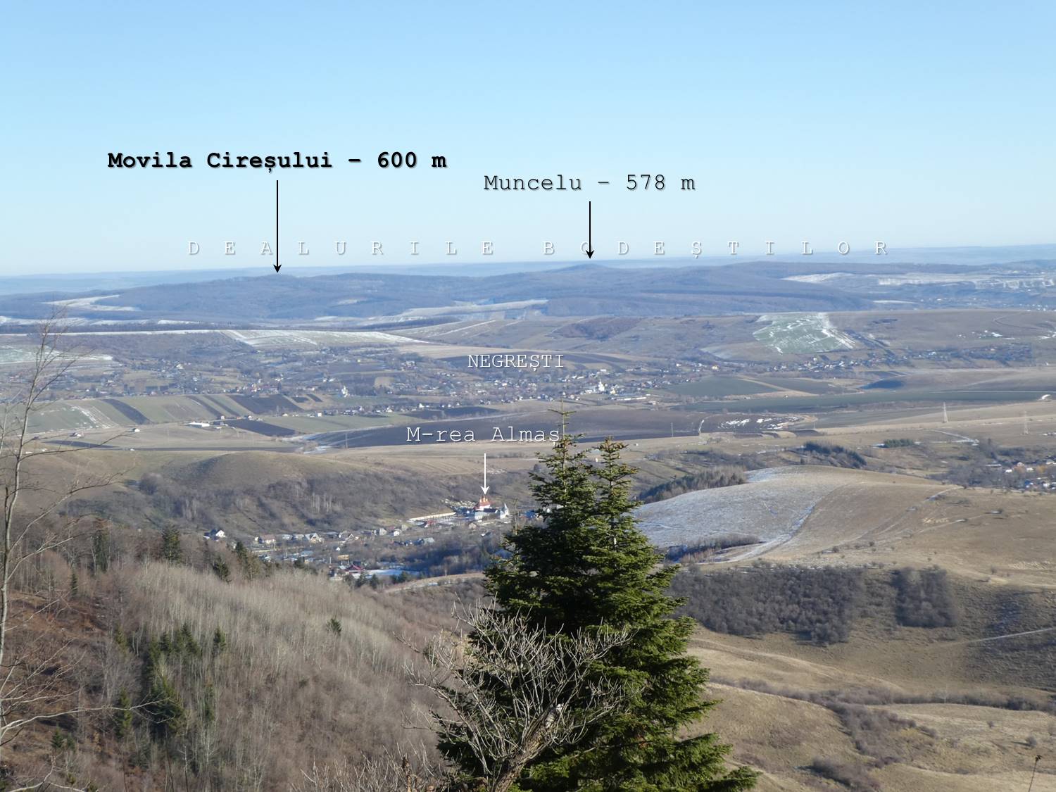 … atingerea … punctului culminant al traseului, cel mai înalt vârf (600 m) al Dealurilor Bodeștilor, Movila Cireșului. Forma perfectă de calotă sferică nu poate sugera decât un tumul !