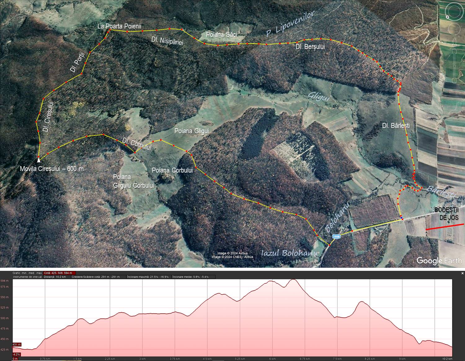 Traseu (5 ianuarie 2025): BODEȘTII DE JOS – Dl. Bârlești – Dl. Berșului – Dl. Nisipăriei – Poarta Poienii – Movila Cireșului – Poiana Gligui – Dl. Corbi – Iazul Bolohanu – BODEȘTII DE JOS