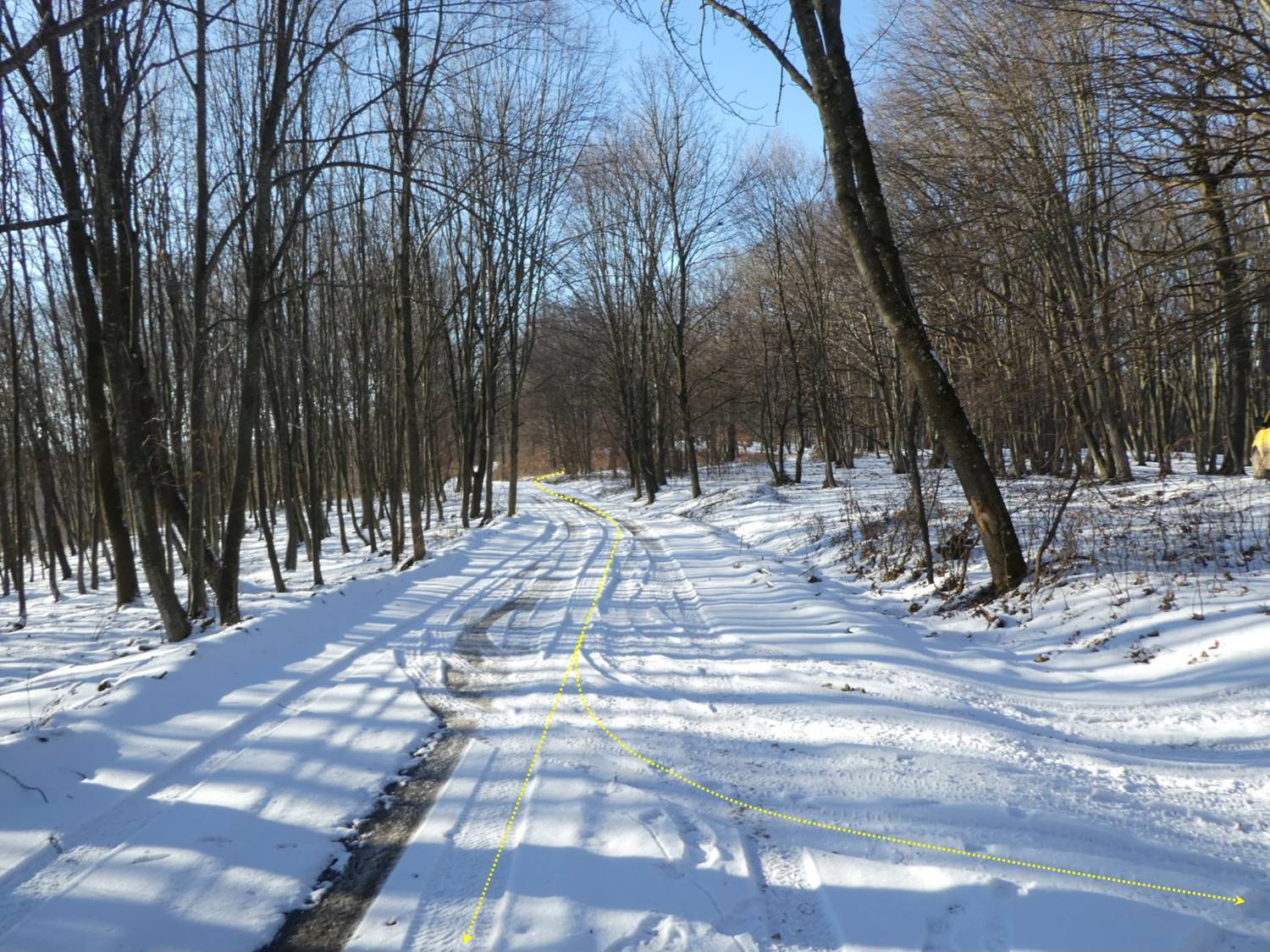 Odată intrați în pădure, urmând un drumeag de exploatare forestieră, de la borna silvică IV 62 vom ține cu strictețe direcția vest, cu prețul părăsirii marcajului silvic cu benzi roșii.