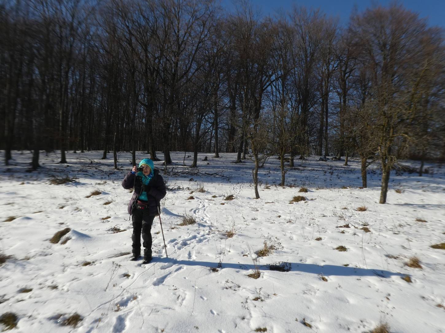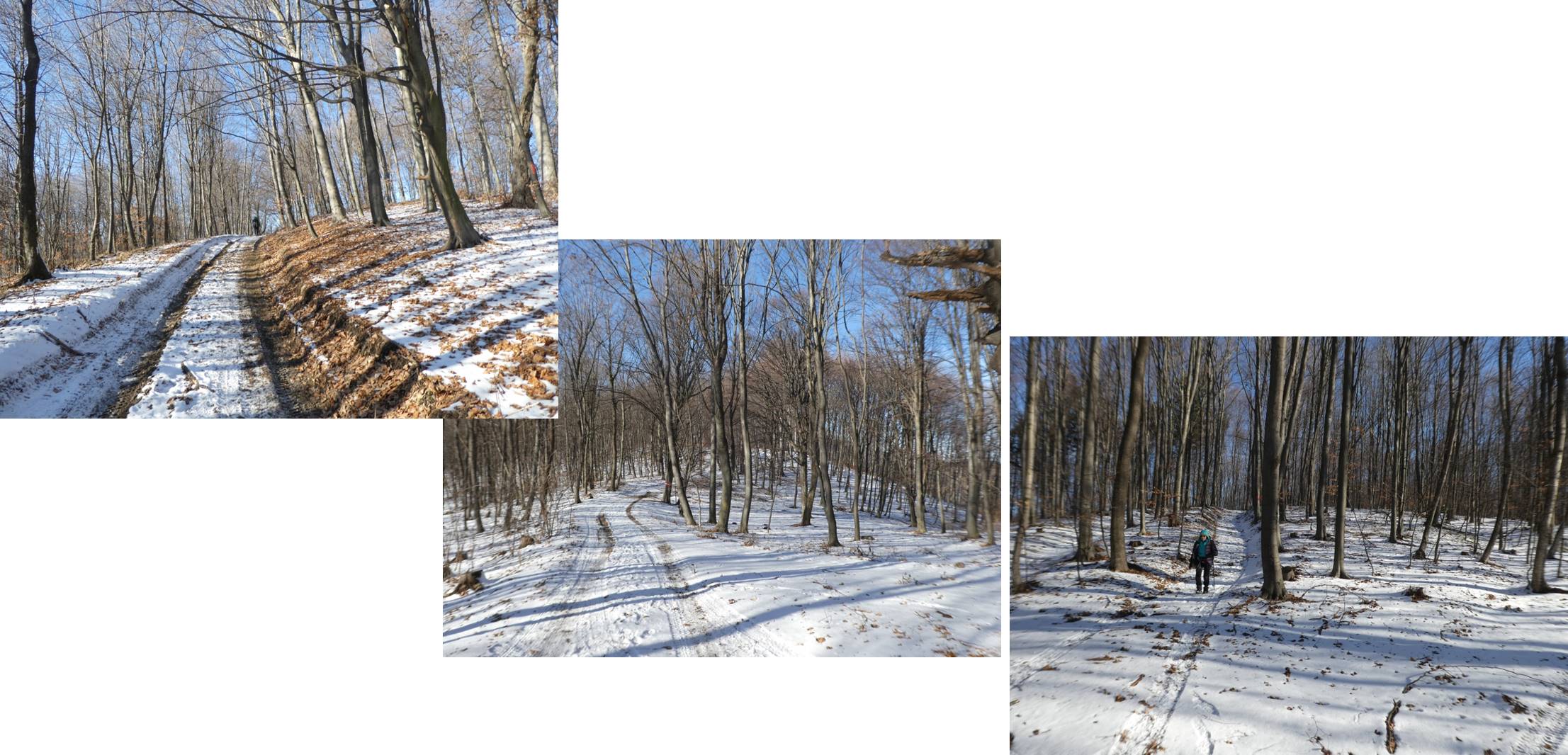 Un drum forestier destul de circulat ține culmea marcată cu benzi roșii, așa că nu avem nicio problemă de orientare; …