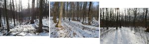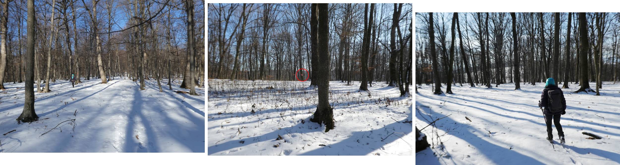 De la cruce urmăm, aproximativ spre sud, drumeagul dintre pădurea regenerată din dreapta și cea matură din stânga, …