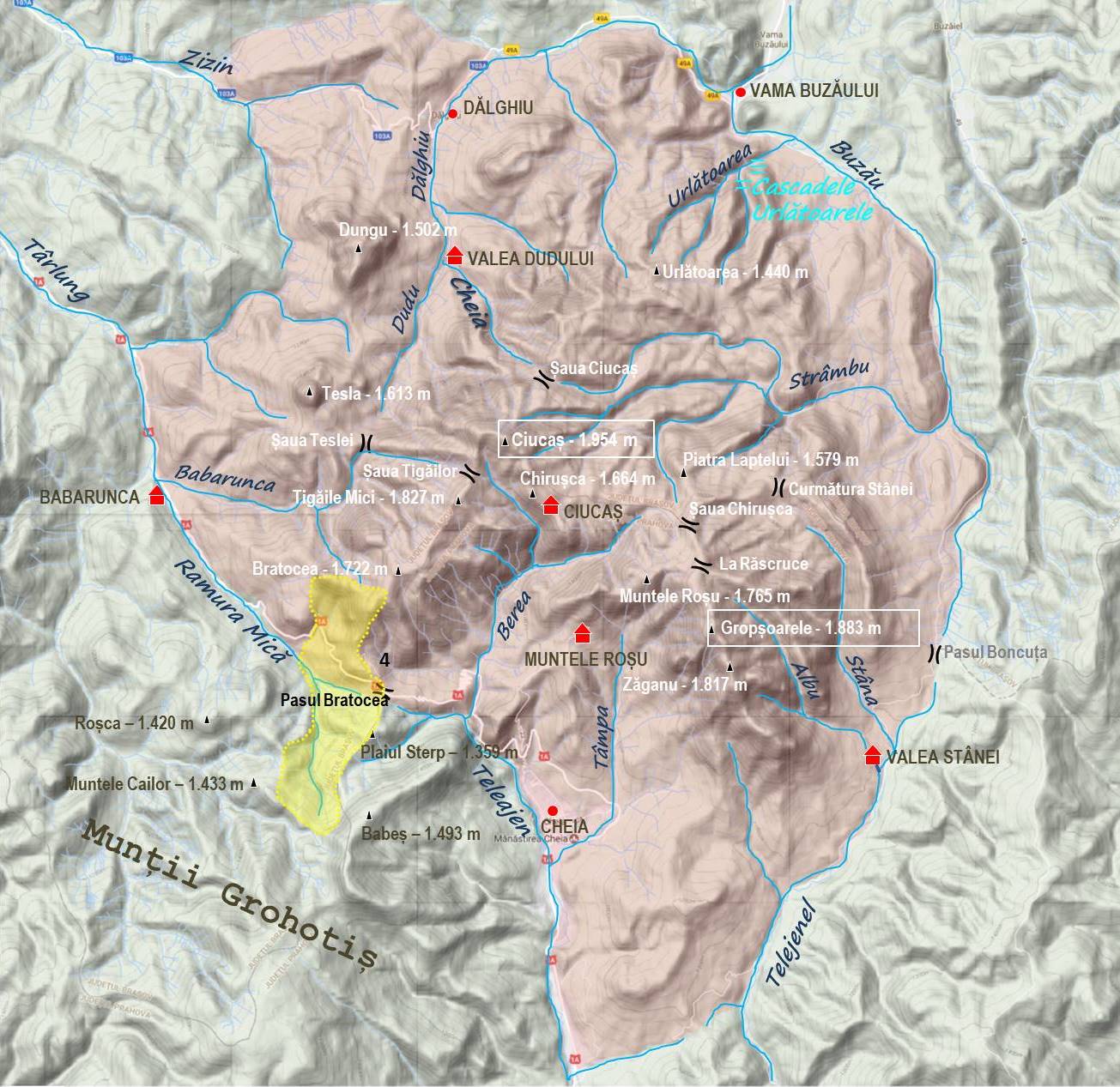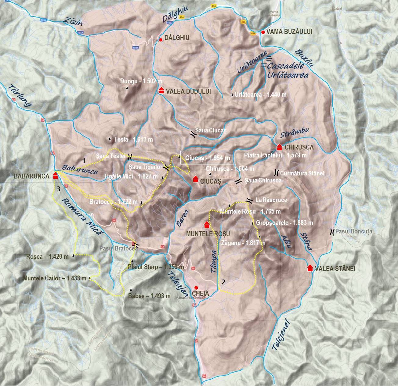 7. Vama Buzăului (Cascadele Urlătoarea și Urlătoarea Mică) – Valea Dălghiului (gura Prundului) – Cabana Silvică Valea Dudului – Plaiul Domnesc – Șaua Ciucaș – Vf. Ciucaș – Șaua Tigăile Mici – Șaua Tesla – Piatra Dudului – Poiana Tesla – Șaua Tesla-Dungu – sub Mt. Dungu – gura Prundului (*)