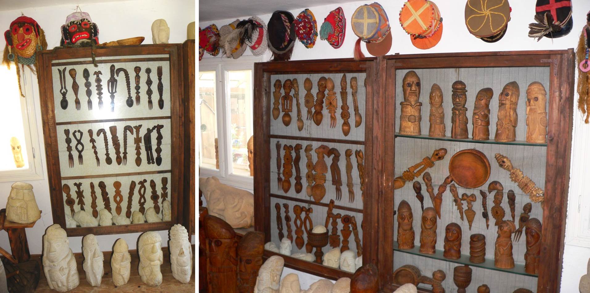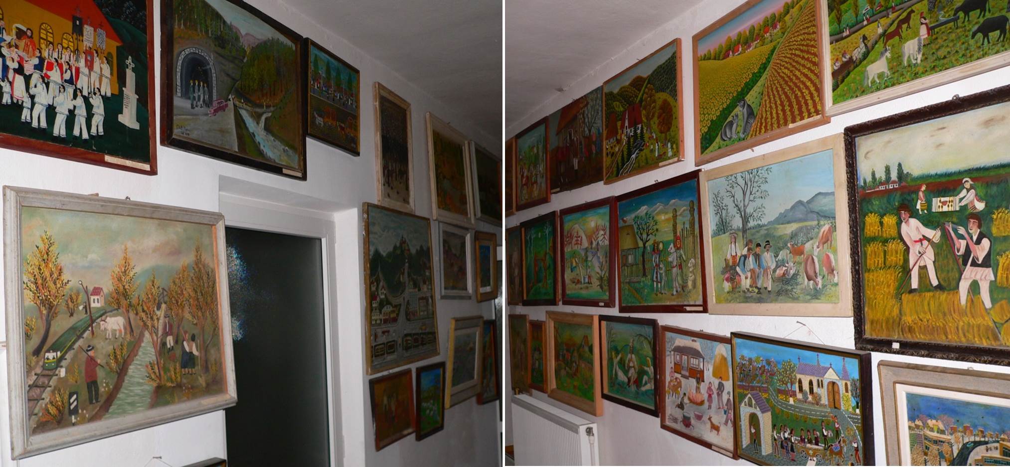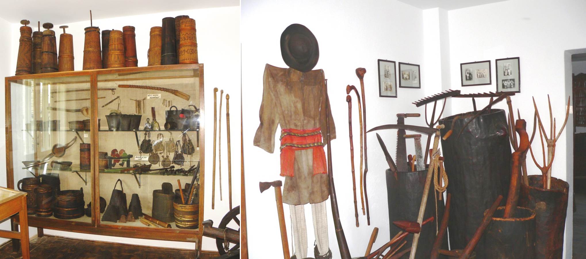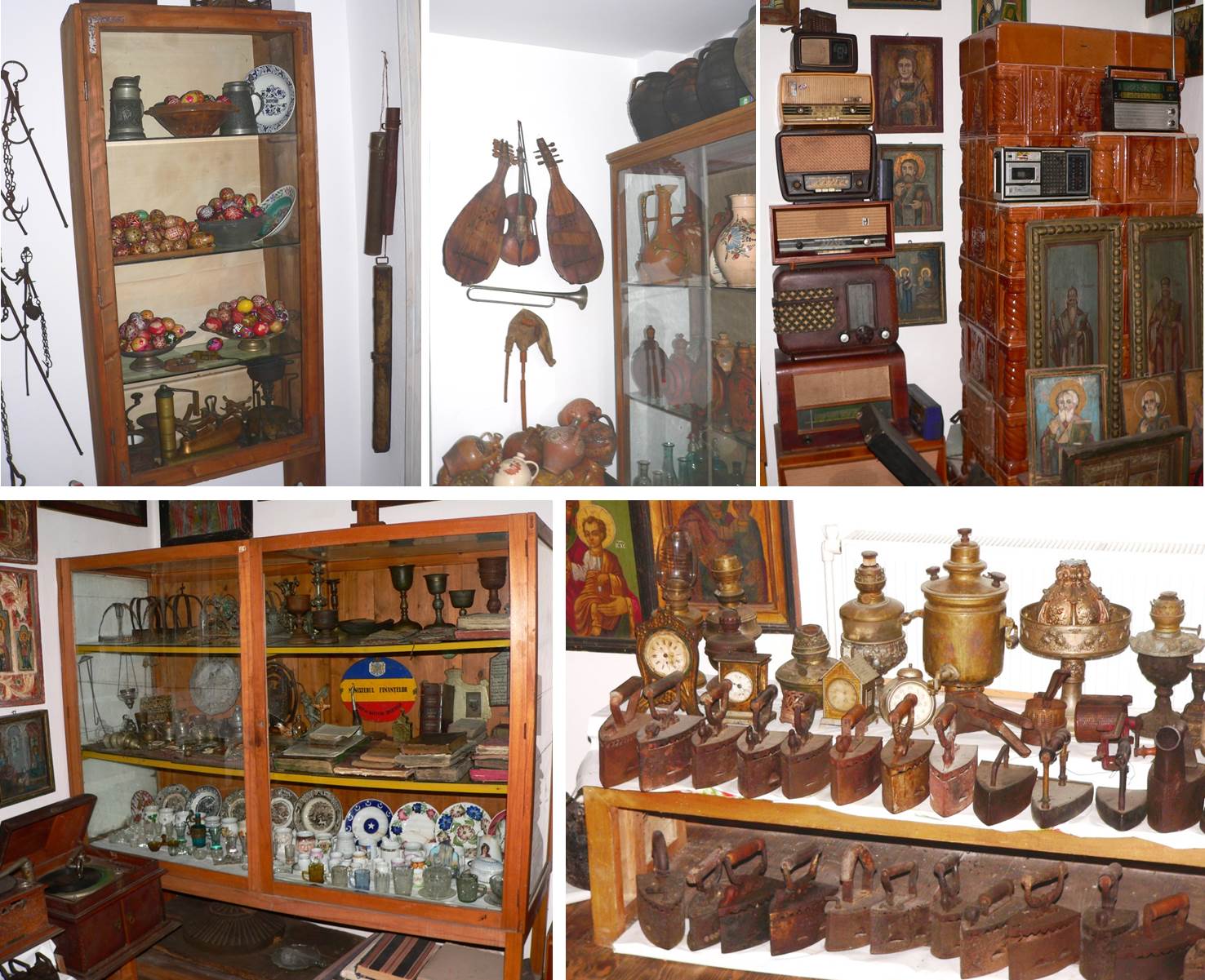 Nicolae Poapa (1919-2010). Sunt expuse lucrări personale – sculptură în lemn și piatră, pictură naivă, artă populară -, dar și o gamă extrem de diversă de obiecte colectate sau colecționate de-a lungul vieții sale: “costume populare, obiecte casnice din lemn, sticlă, marmură, porţelan, ceramică, fier, tablă, aramă, cornuri sculptate, prosoape, cojoace şi bundiţe, curele din piele cu mărgele, curele ciobăneşti cu rozete, talăngi şi clopote (…), unelte pentru păstorit, rîşniţe pentru măcinat, ceasuri, gramofoane şi patefoane, ouă încondeiate, sumane din lînă cu sărad, obiecte de ţesut lînă şi cînepă, icoane pictate pe lemn şi pe sticlă, numismatică, insigne, decoraţii, tablouri şi fotografii vechi, săbii, harbalete, suliţe, ghiulele de tun şi pistoale cu petiţă, plus foarte multe obiecte de cult religios (…), un plug de lemn, o tunică de roşiori din garda lui Cuza, un bucium şi un costum complet ciobănesc, cobzele şi vioara lăutarilor (…) ” (Neculai Popa – Povestea vieții mele – Editura Adan, Piatra Neamț, 1996)