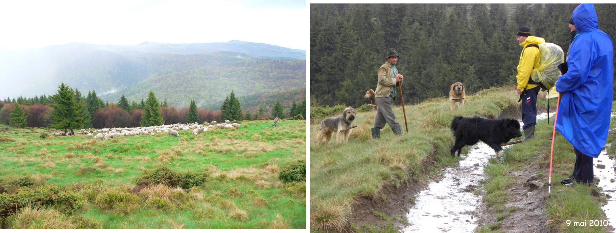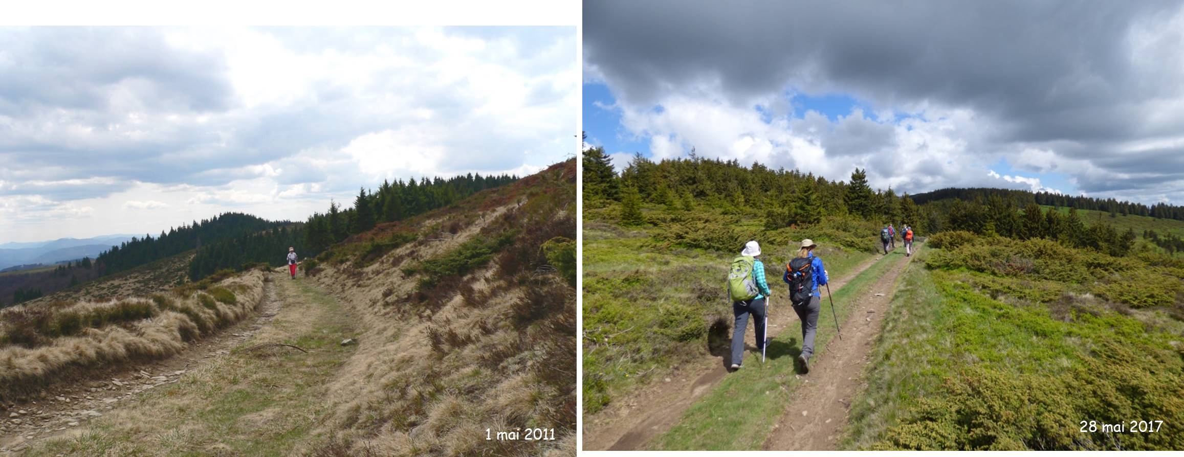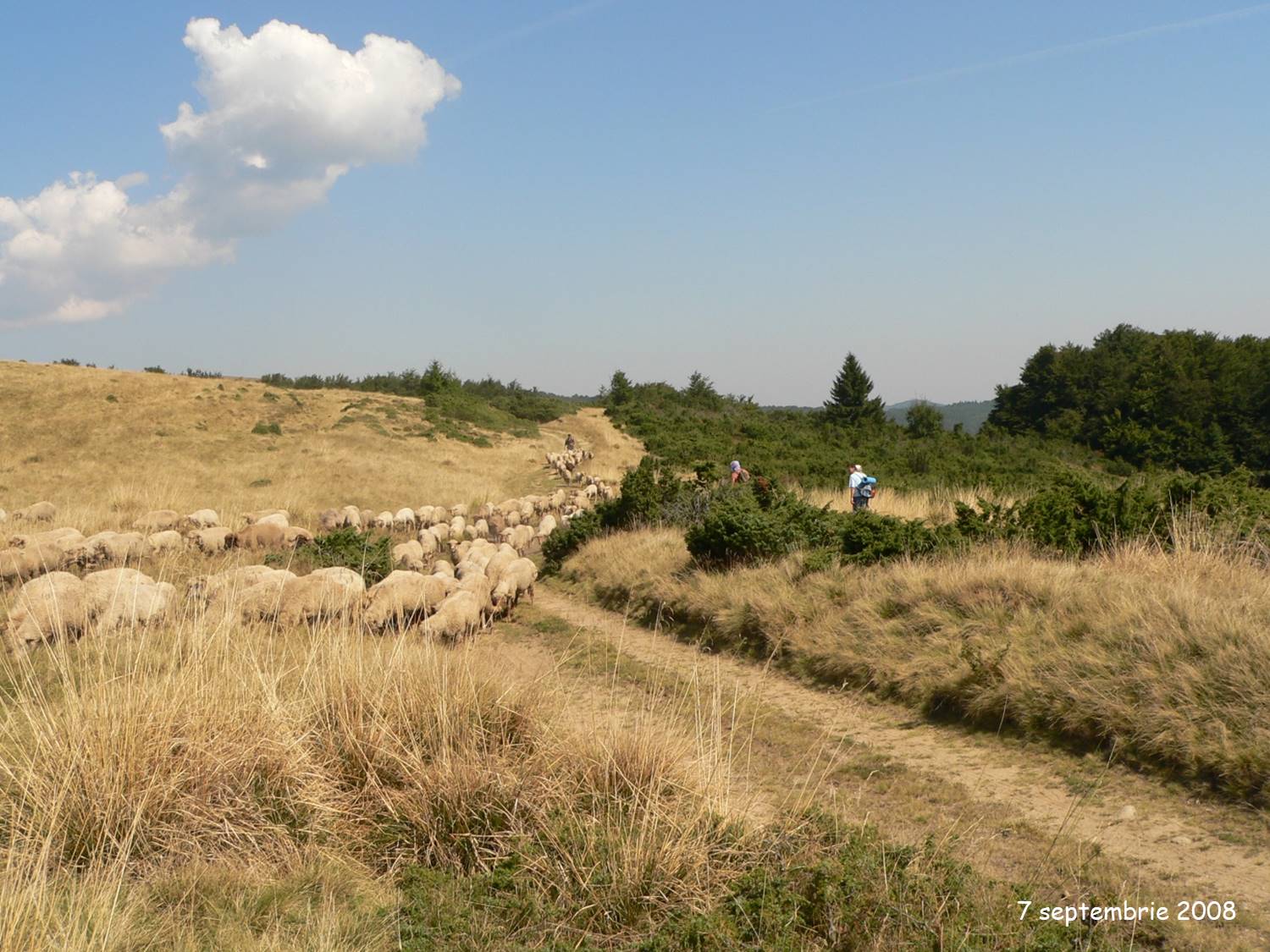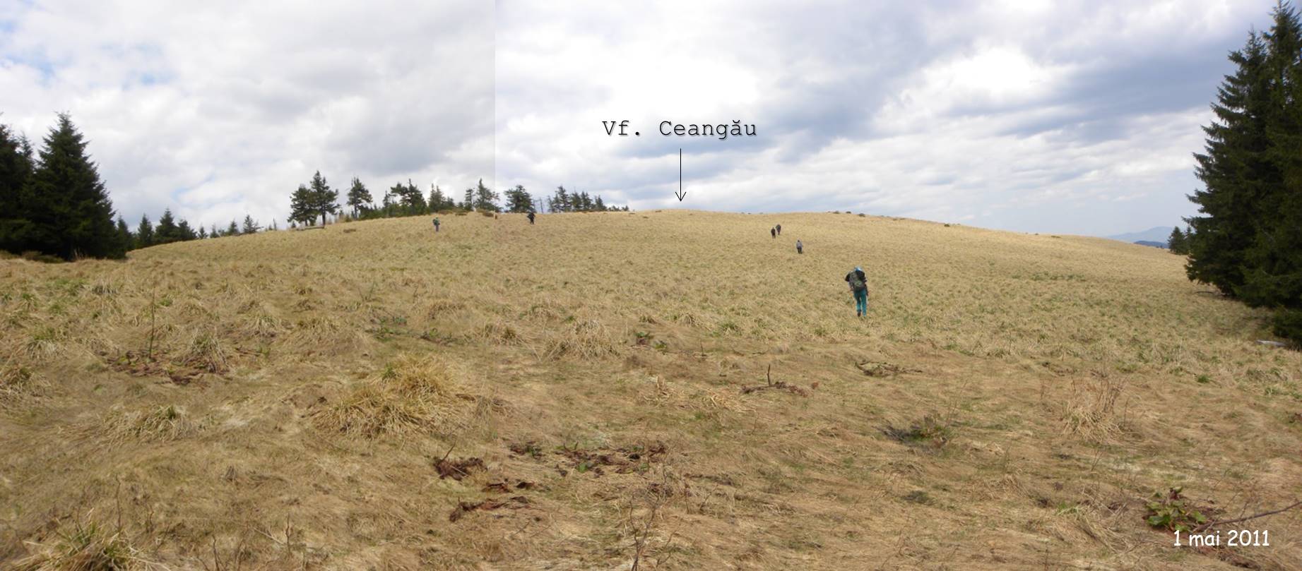 … pentru a ieși în marea poiană de pe Muntele Ceangău. În mod normal (sic !) poteca marcată ține marginea de jos a poienii, părăsind-o repede.
