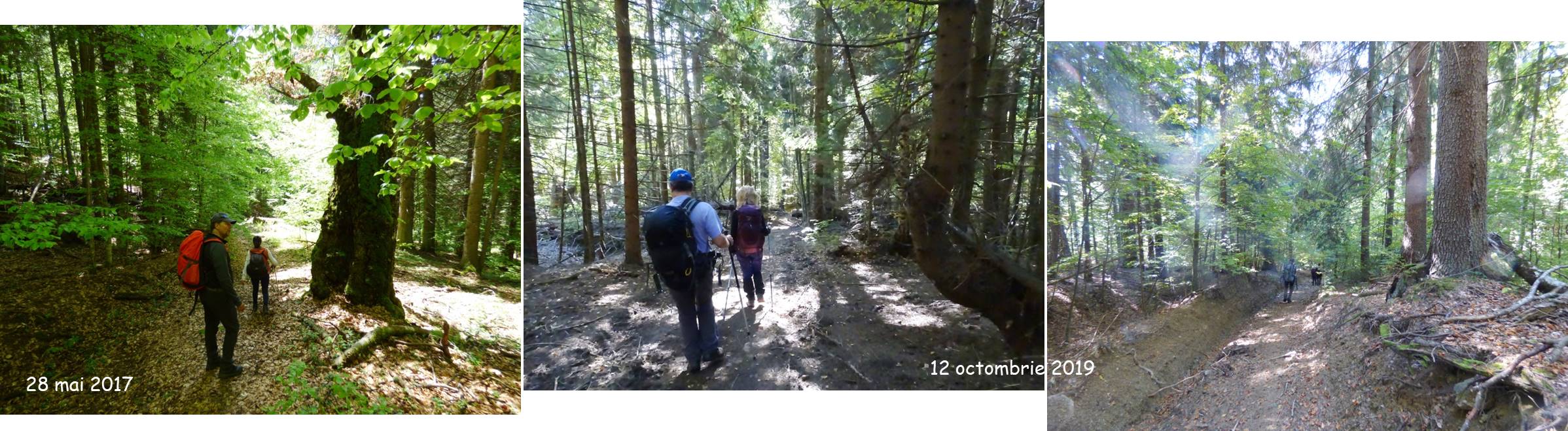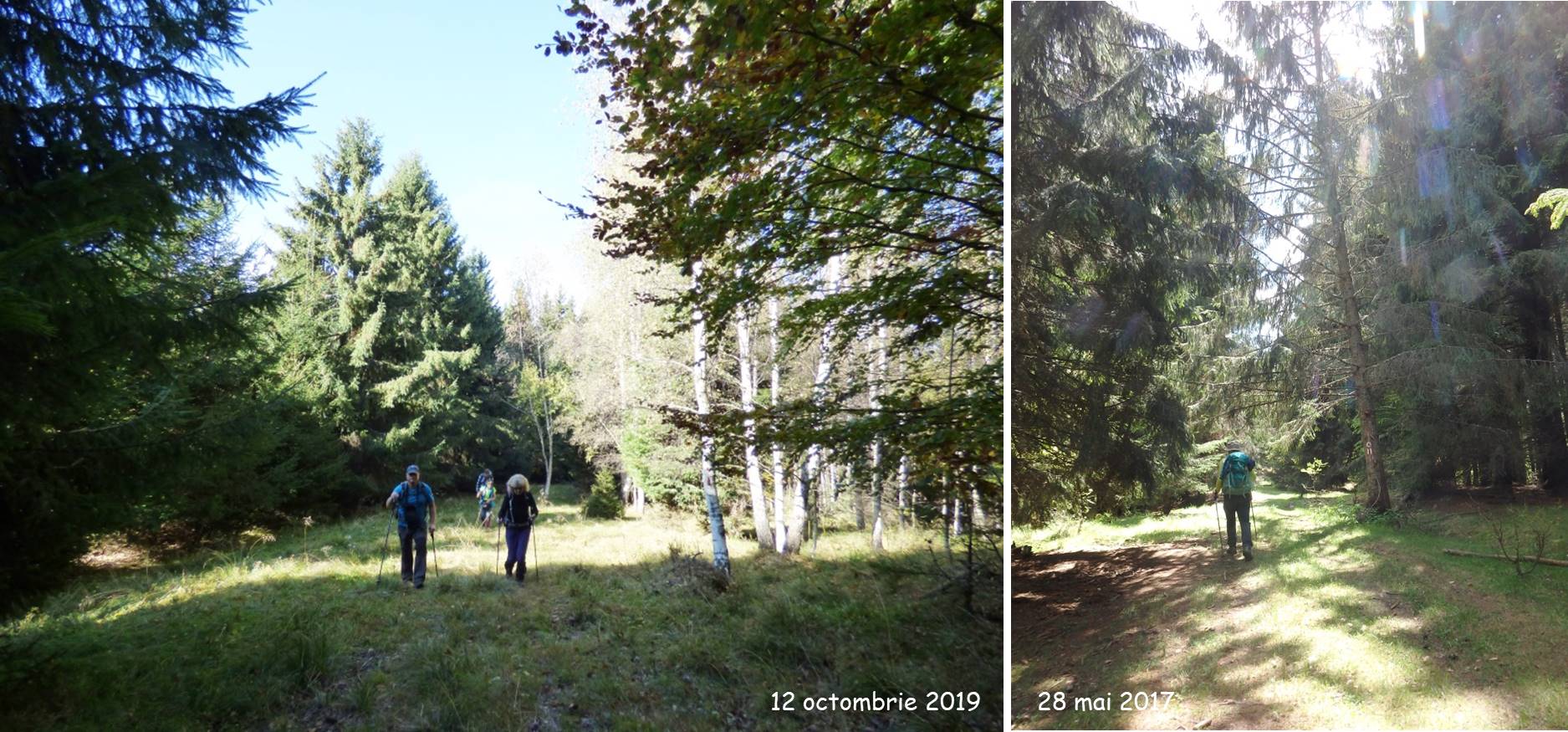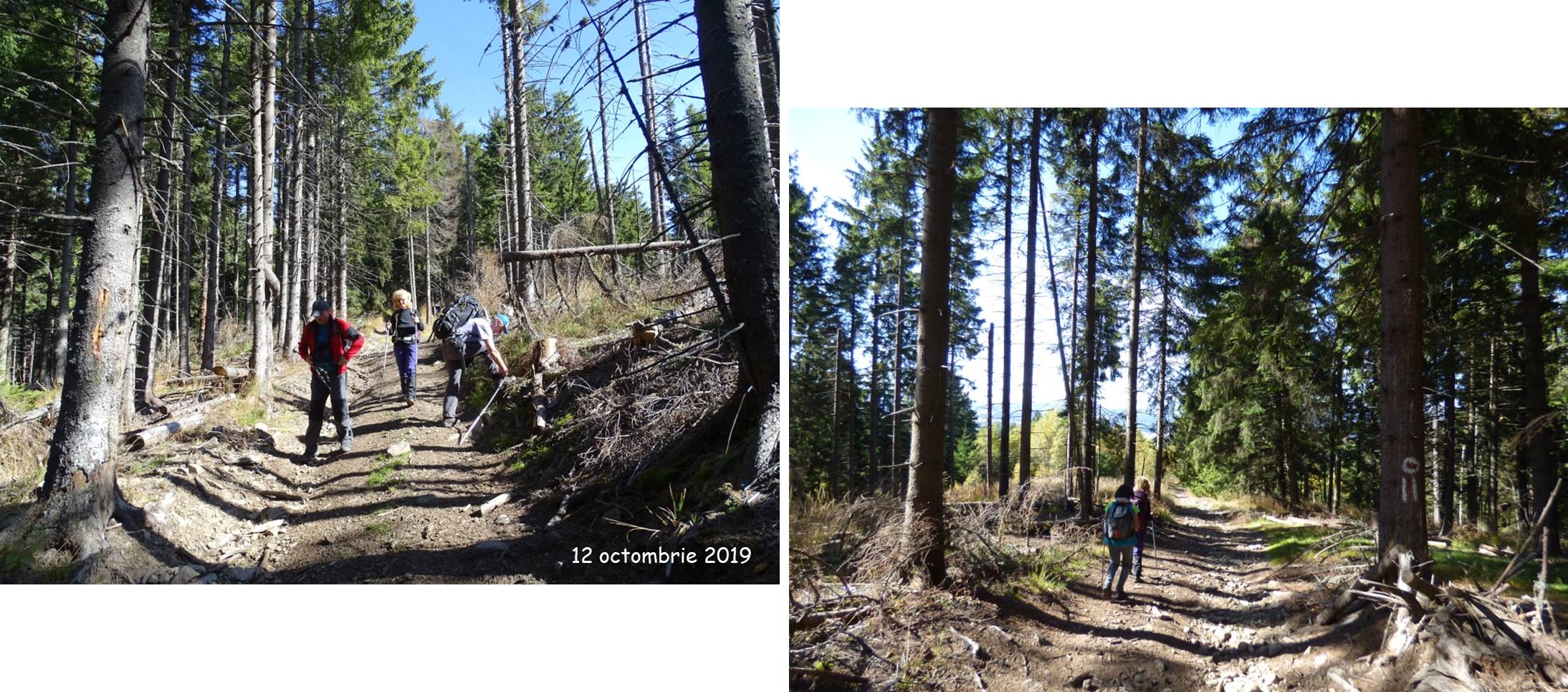 Coborâm spre Pasul Cărpineni, fie pe drumul din pădure, …