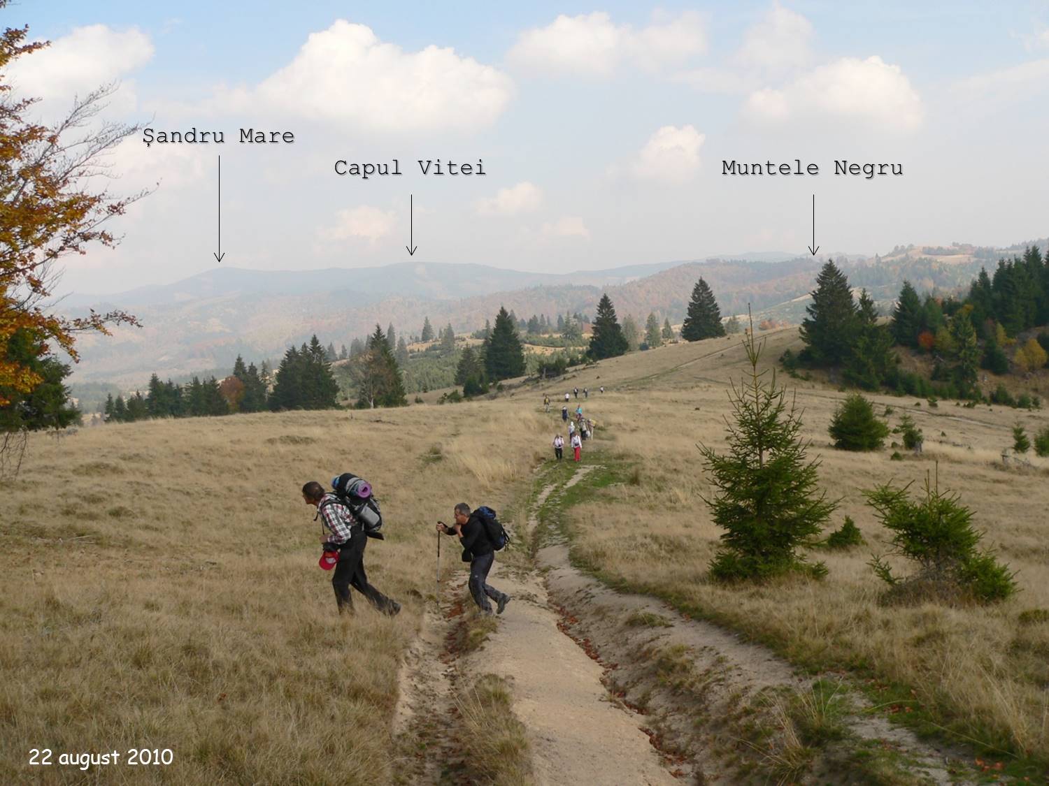Din poienița de pe Vârful Capul Vitei vom pleca la vale, spre sud, pe urmele marcajului bandă roșie, dublat de punctul roșu întâlnit pe vârf (și care duce, spre nord, până pe vârful Șandrului Mare) !