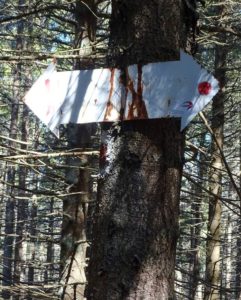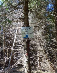… se remarcă o altă intersecție de poteci și datorită apariției, pe cea din dreapta, a pătratelor albastre ce marchează hotarul rezervației naturale “Nemira” (ce include și Vârful Șandru Mare); culmea este că aici se ajunge venind pe traseul “bandă roșie” (chiar apare un semn lângă pătratul albastru) dinspre Pasul Oituz, dar pe care marcajul apare extrem de sporadic, pe lungi distanțe, aproape deloc !