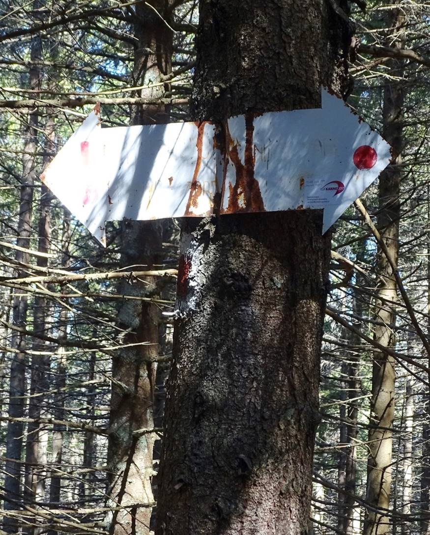 – Venind dinspre Muntele Negru și ajunși în zona Vârfului Capul Vitei (care nu este foarte bine individualizat) “crucea roșie” dispare brusc, lăsând punctul roșu să continue singur … înainte; lateral, spre dreapta, se formează o potecă unde, peste câțiva pași, se află un indicator ce arată direcția spre Pasul Oituz ! Nu departe, de aici spre Șandru Mare, pe poteca, acum, doar a “punctului roșu”, vom întâlni, în dreptul unei noi intersecții cu o potecă ce se desprinde spre dreapta, …
