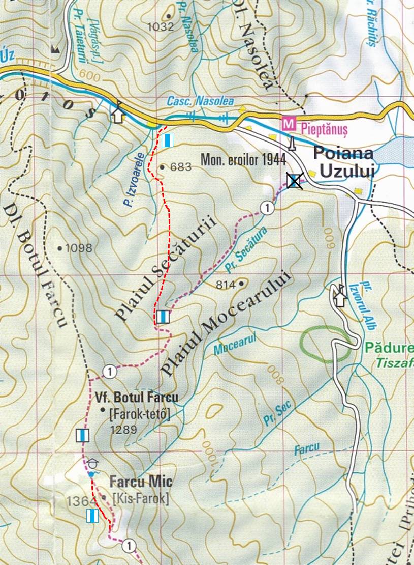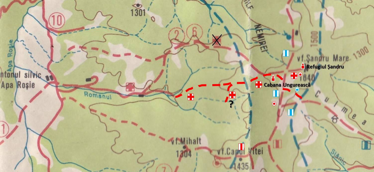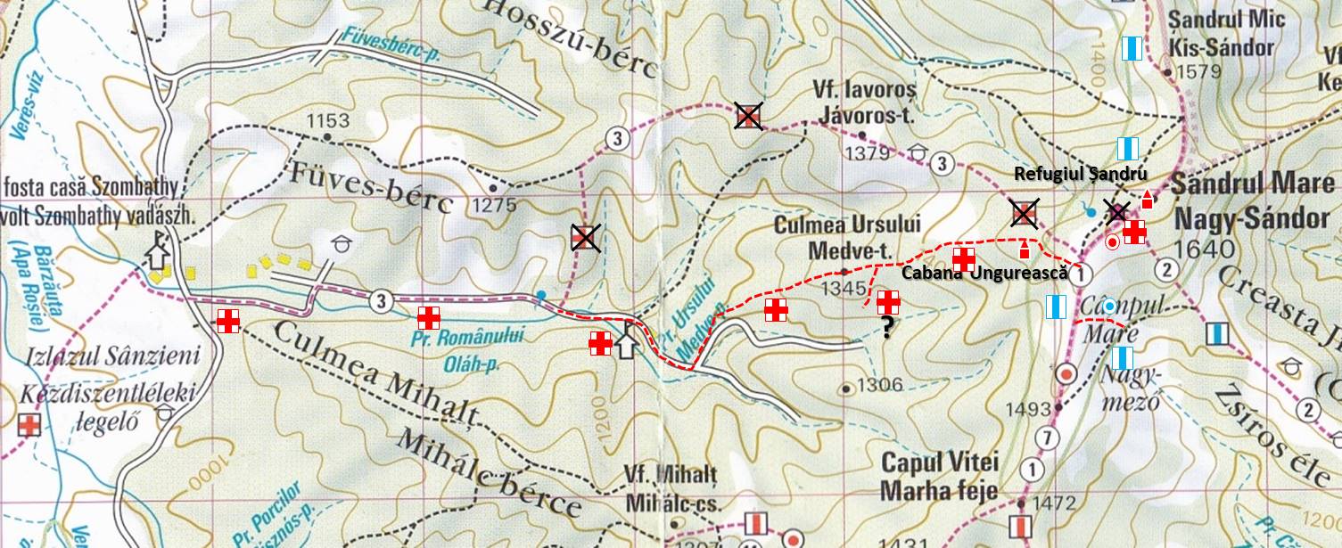 Cu “crucea roșie”, mai bine spus, cu poziționarea traseului ei pe hărți, este o problemă mai gravă: vorbim aici despre porțiunea de traseu cuprinsă între gura pârâului Ursu (afluent al Românului – și nu al Romanului – cum apare pe două dintre hărțile pomenite) și Cabana Ungurească, refugiu aflat puțin sub punctul de întâlnire al “crucii roșii” cu “punctul roșu” (dar și cu “banda albastră”). De sub acest loc, plecând spre vest, izvorăște pârâul Ursu, versantul său drept fiind un interfluviu relativ major, Jávoros (posibil, cu înțelesul de al Arțarului, dar românizat, Javaroș/Javoroș), iar cel stâng, unul minor, Ursu (Medve, în maghiară). Marcajul este trasat pe culmea Ursului, coborând în valea emisarului său, Românul, chiar în amonte de confluență (de ce ? – pentru că există o potecă bună pe linia culmii până la la confluență !); ca o (altă) curiozitate, există o ramură a potecii de pe culme – pe stânga în coborâre – marcată tot cu cruce roșie ce, probabil, se lasă și mai în amonte în valea Românului ! Problema este că, pe hărți, traseul este înscris pe culmea Javaroșului, de pe care, la un moment dat, coboară pe valea Ursului urmărind-o până la confluența cu Ursul (și de aici, mai departe, pe valea Românului – ca în realitate de această dată). Un comentariu suplimentar: recomandăm traseul – nemarcat – de pe culmea Javaroșului, de pe care se trece pe cea a Fuveșului (românizare din Füves, însemnând, de fapt, Ierboasa), pentru panoramele cu totul de excepție spre depresiunea Apa Lină și … barierele muntoase de dincolo de ea, traseul de pe valea Românului fiind anost din punctul de vedere al priveliștilor !
