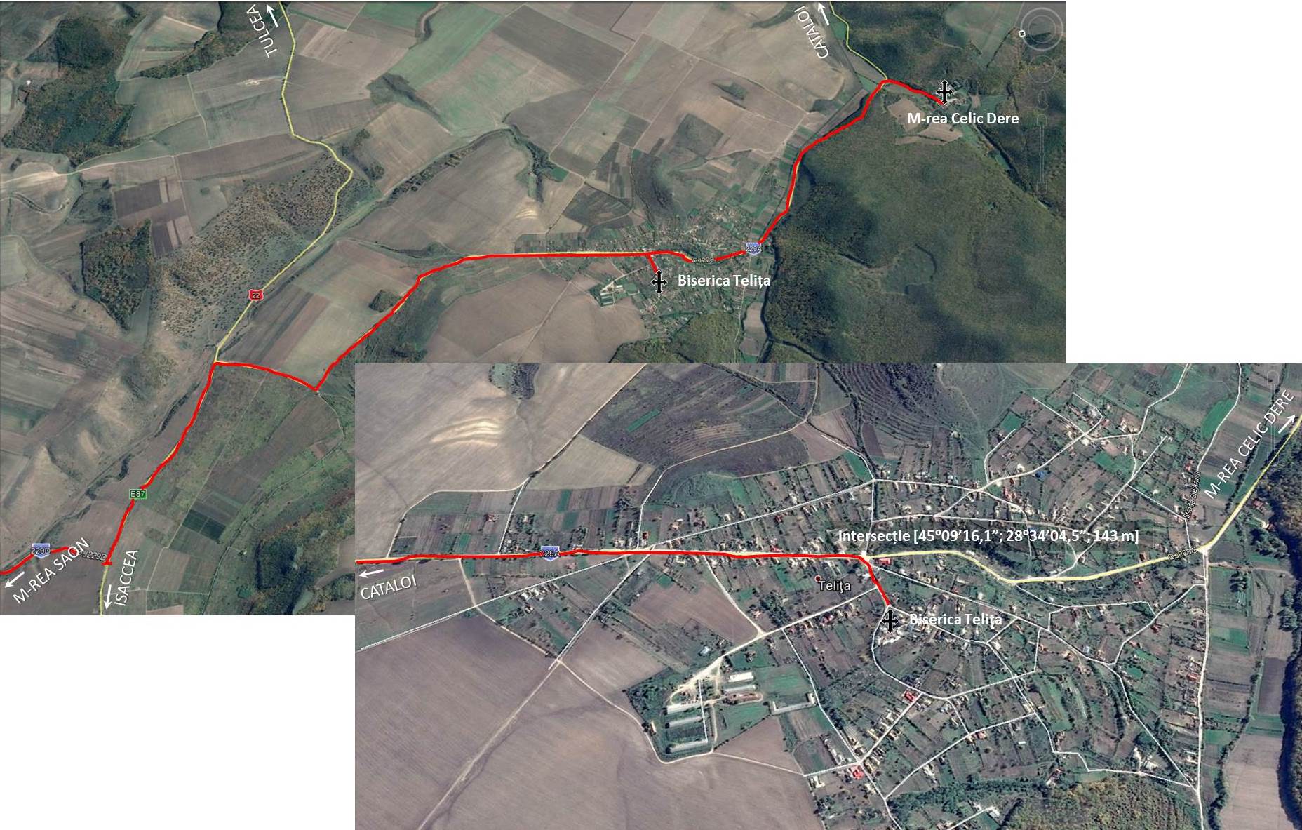 – 4 km până la Biserica Telița pe DJ 229A, asfaltat, stare bună;