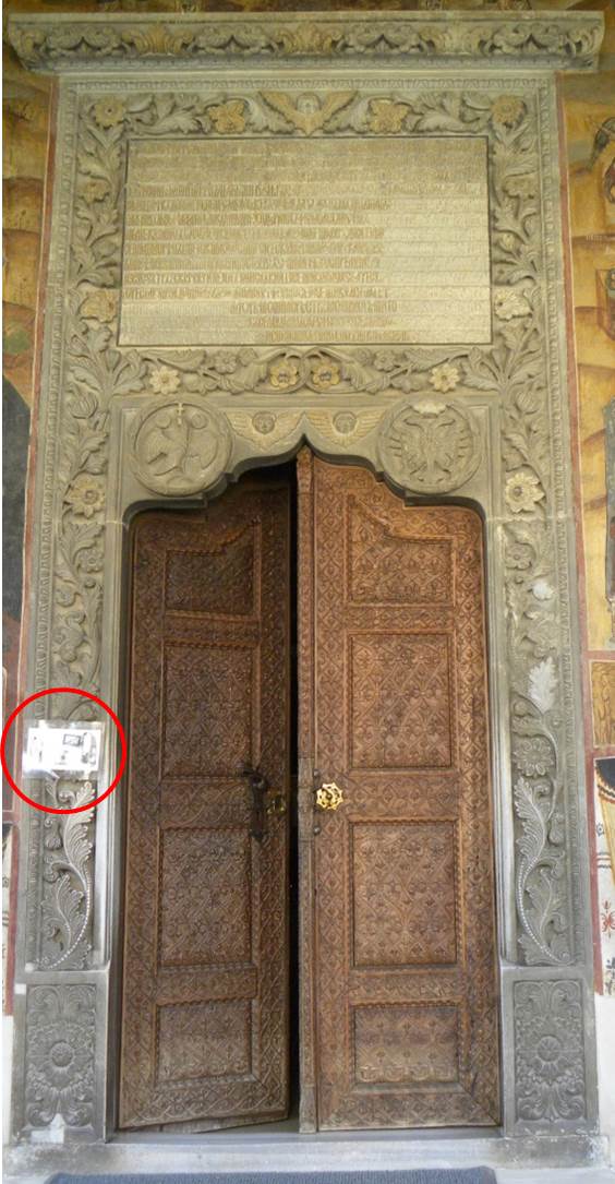 Dincolo de ușa de lemn cu încrustații minuțioase (ce pare dintr-o epocă mai aproape de zilele noastre), cu ancadramentul bogat și … brâncovenesc sculptat în piatră, în pronaos sunt pictați membri ai familiilor Brâncoveanu și Cantacuzino – fiii, frații, părinții, bunicii – paterni și materni. Dar fotografiatul în interiorul bisericii este interzis (după cum avertizează înscrisurile … cabalistice atât de … armonios integrate printre frunzele de acant incrustate pe stâlpii de piatră ai ușii).