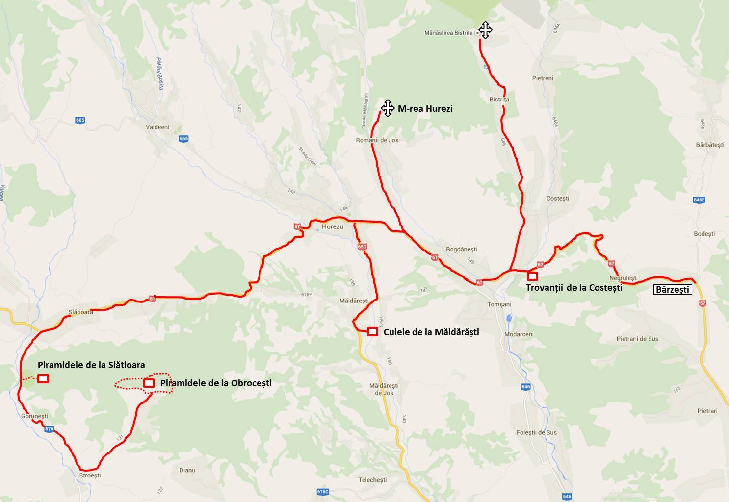 Bârzești – Trovanții de la Costești [5 km pe DN 67 – stare f. bună] – Mânăstirea Bistrița [1 km pe DN 67, 7 km pe DJ 646 – asfaltat, în stare bună] – Mânăstirea Horezu [7 km pe DJ 646, 3 km pe DN 67, 3 km pe DJ 669 – asfaltat, în stare bună] – Culele de la Măldărăști [3 km pe DJ 669, 1 km pe DN 67, 3 km pe DN 65C – în stare bună] – Piramidele de la Slătioara [1 km pe DN 65C, 3 km pe DJ 676H – asfaltat, în stare bună, 6 km pe DN 67, 2 km pe DJ 676 – asfaltat, în stare bună] – Piramidele de la Obrocești [3 km pe DJ 676, 3 km pe DC 131 – asfaltat, în stare bună] – Bârzești [3 km pe DC 131, 5 km pe DJ 676, 22 km pe DN 67]