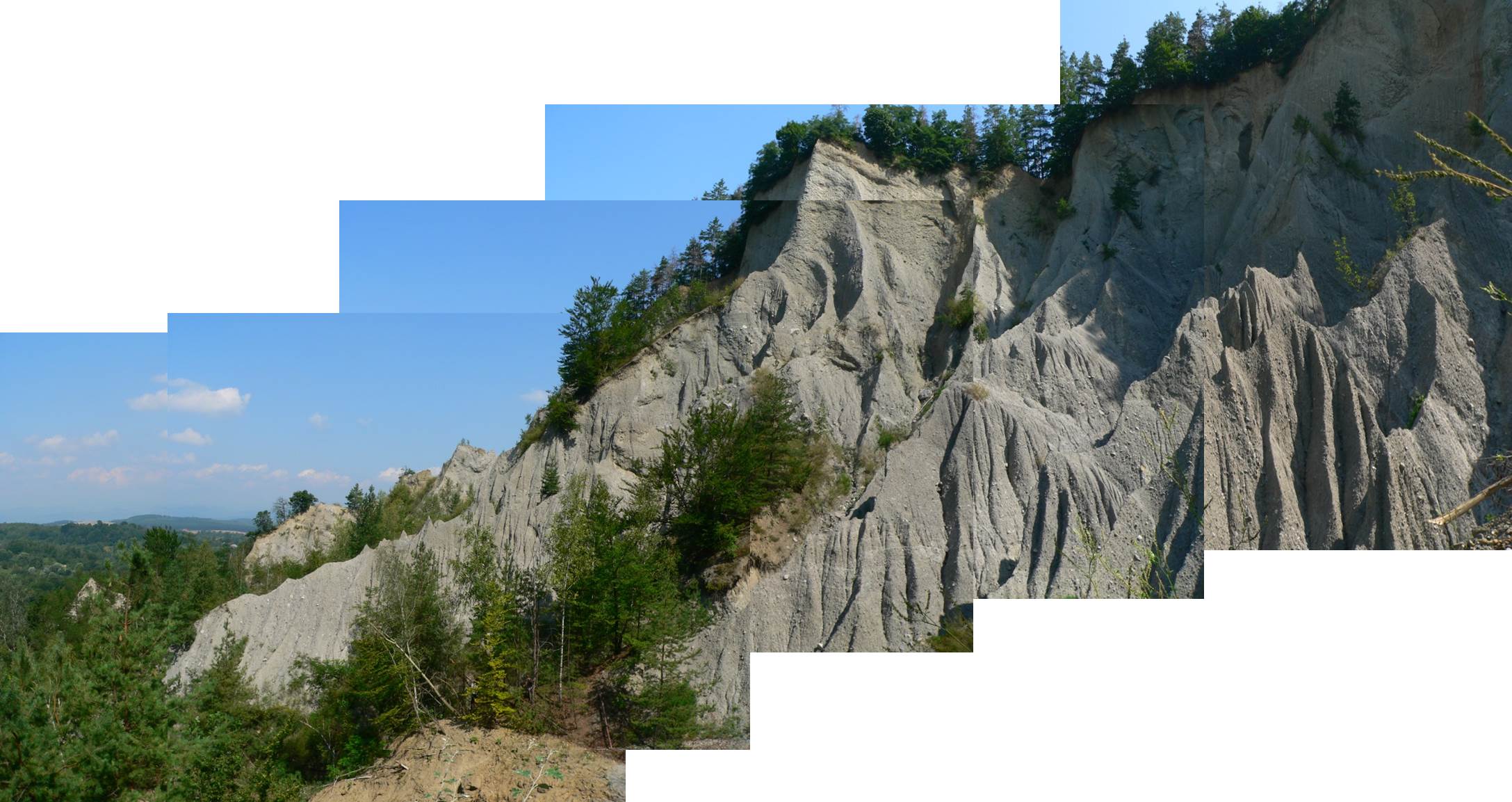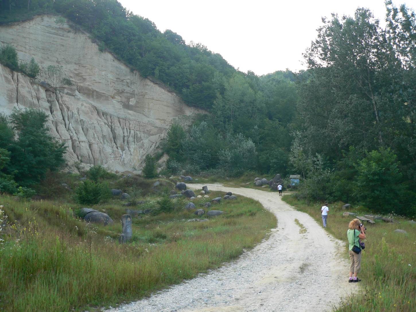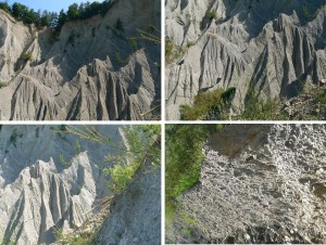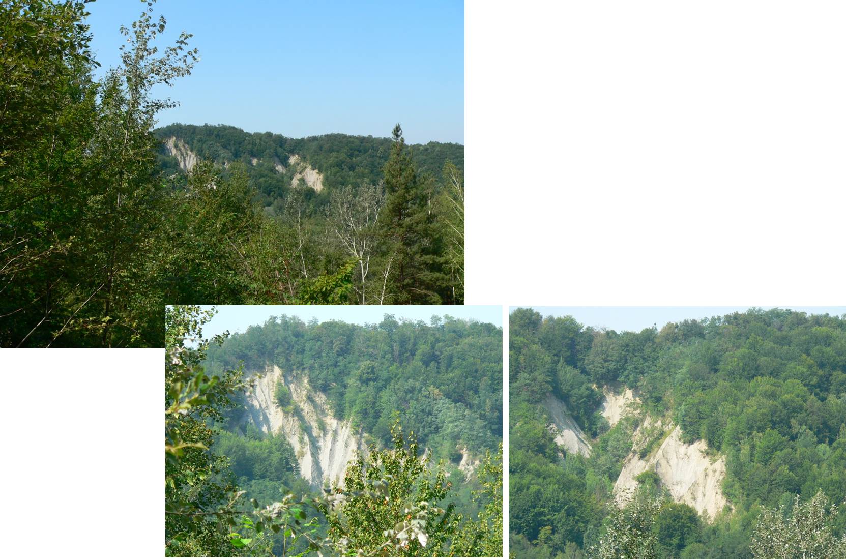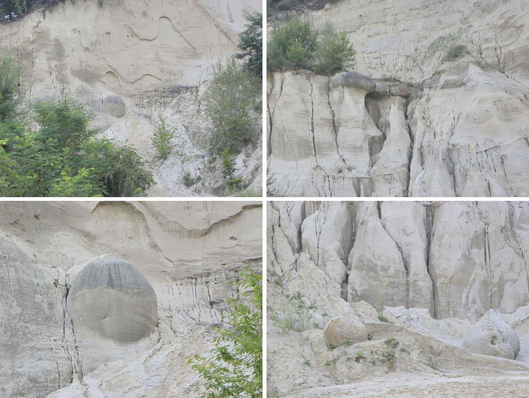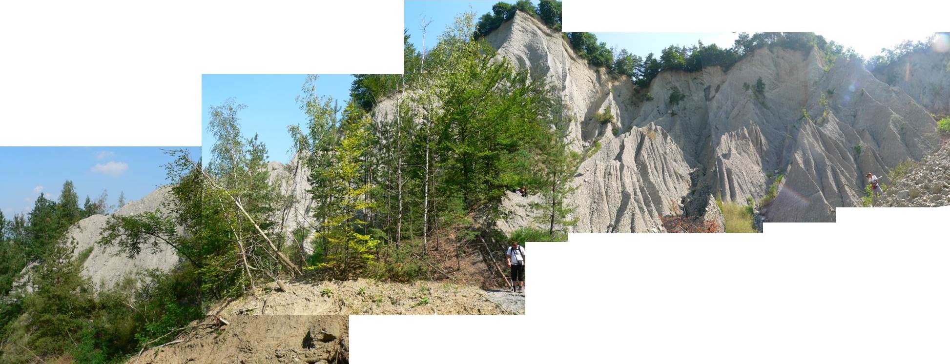… ce ne duce spre latura nordică a … ansamblului de piramide: martori ai eroziunii conjugate a apei de precipitație, înghețului-dezghețului și vântului produse asupra unor strate formate din nisipuri, pietrișuri și argile, slab cimentate.