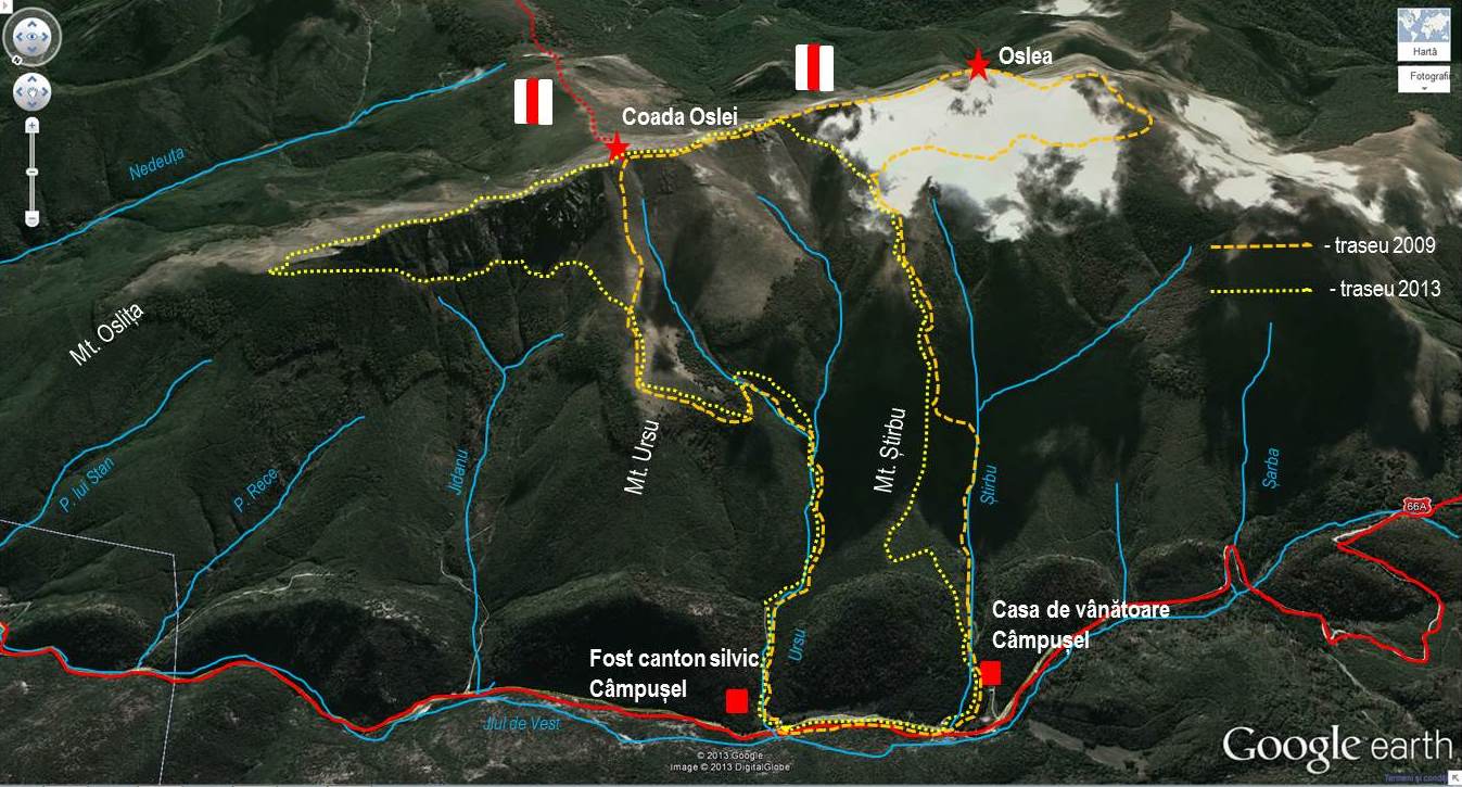 Traseu: Cantonul silvic Câmpușel – Valea Ursu – Mt. Ursu – sub Coada Oslei – Coada Oslei – Vf. Coada Oslei – spre Vf. Oslea – Mt. Știrbu – Valea Știrbu – Cantonul silvic Câmpușel