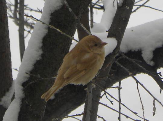 De ceva timp suntem des vizitaţi de câţiva porumbei şi un stol de vrăbiuţe. Ca să fim sinceri, noi îi cam invităm, momindu-i cu firmituri de pâine, presărate pe pervazul geamului de la bucătărie. Odată cu primele zile de primăvară au reapărut graurii, pentru care ramurile prunului din faţa bucătăriei sunt, de câţiva ani, loc de odihnă şi … cântat; dar şi de întâlniri romantice cu … grăuriţele. Acest punct de vedere este întru totul împărtăşit de o pereche de guguştiuci ! Un măcăleandru a trecut şi el, prin prun, pe la Crăciun; era singur ! L-am văzut din nou, ieri, tot singur! Mai ieri s-a suit în prun o codobatură-albă; lucru de mare mirare pentru o pasăre ca ea, atât de terestră! Au mai trecut pe la noi şi o fâsă-de-luncă, un codroş-de-munte şi o cinteză. Cea mai mare surpriză ne-a făcut-o cinteza, care nu a venit singură ci cu o surată mai … ciudată ! Încă de pe când era în … ou s-a ales cu un fel de … blonzeală, numită în limbaj … păsăresc leucism !
