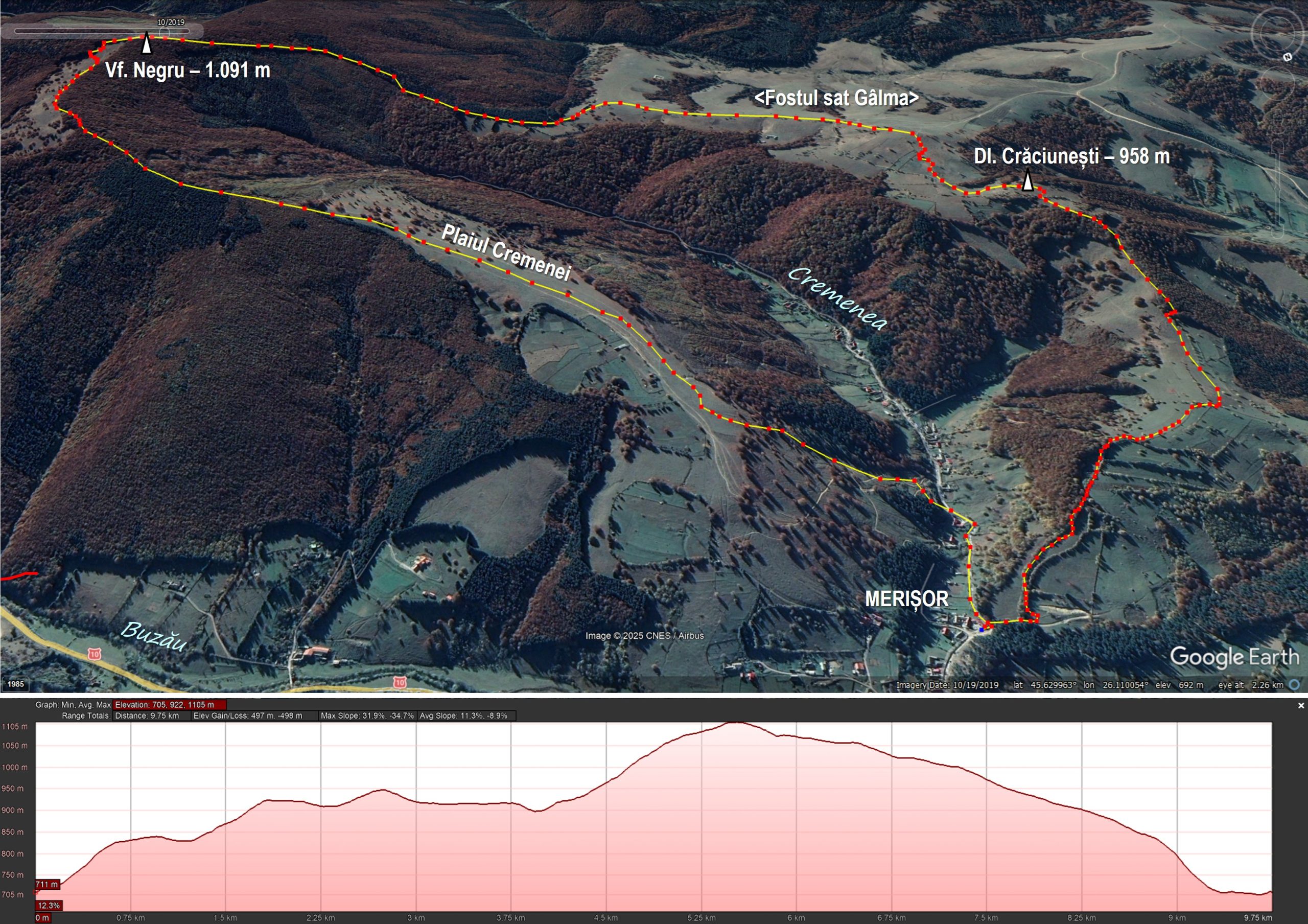 Traseu: MERIȘOR – Dl. Crăciunești – Fostul sat Gâlma – Vf. Negru – Plaiul Cremenei – MERIȘOR