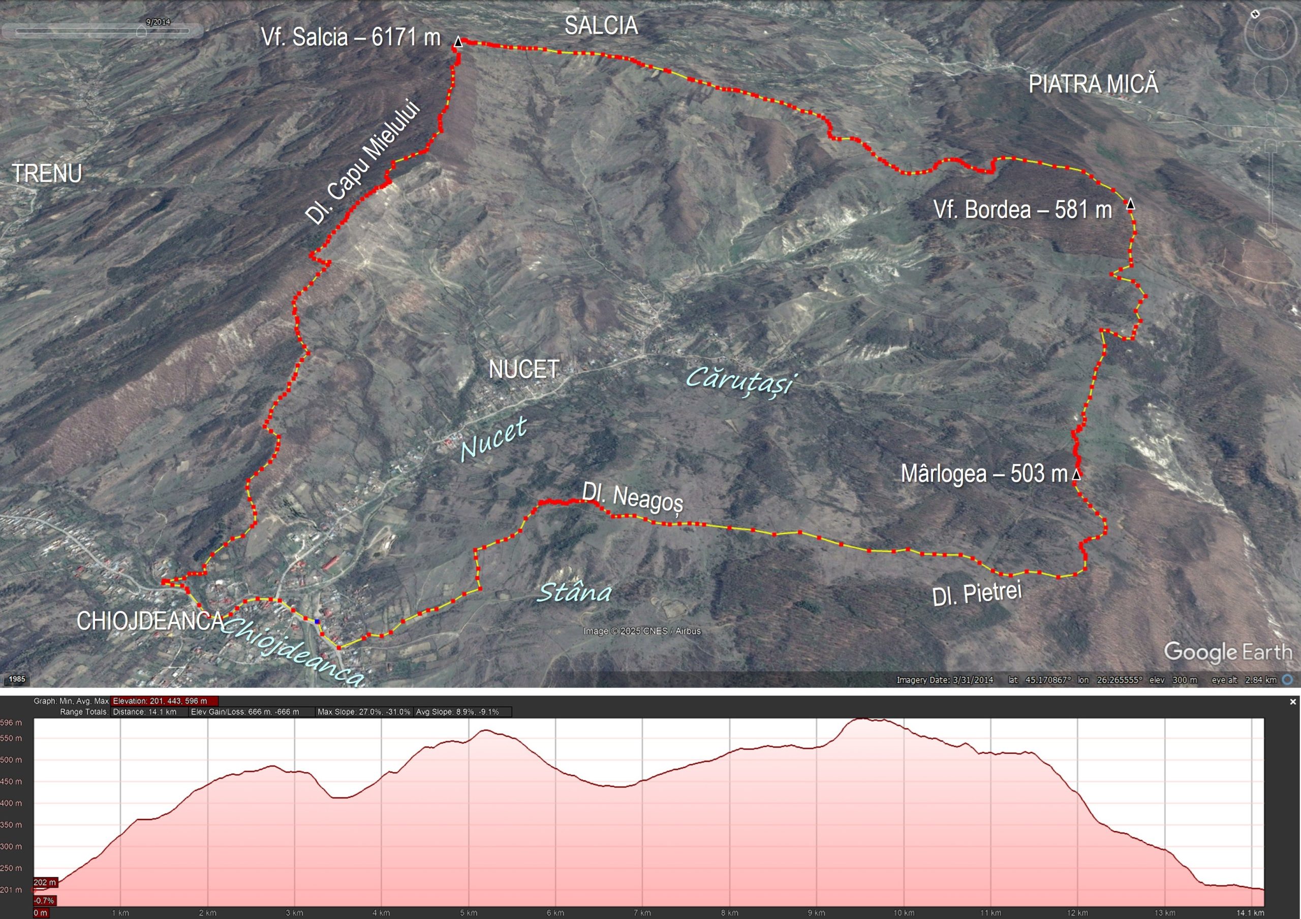 Traseu: CHIOJDEANCA – Dl. Neagoș – Dl. Pietrei – Vf. Mârlogea – Vf. Bordea – Vf. Salcia – Dl. Capu Mielului – CHIOJDEANCA