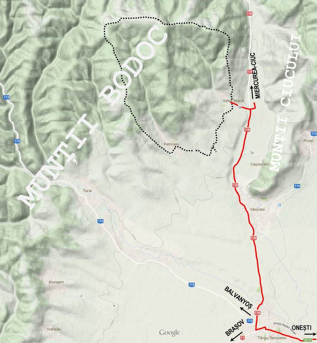 Traseu auto: Onești – Tg. Secuiesc (70 km pe DN 11/E 574, stare f. bună) – Sânzieni – Valea Seacă (10 km pe DN 11B, stare f. bună; 1 km pe uliță pietruită)