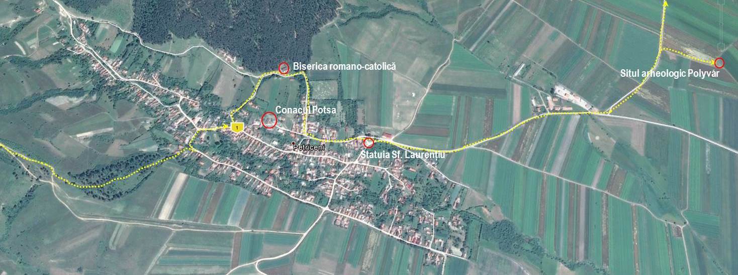 … ne conduc la intrarea/ieșirea satului unde, în anul 2009, a fost sfințită statuia Sf. Laurențiu, patronul bisericii, operă a artistului Winkler Imre din Poian/CV.