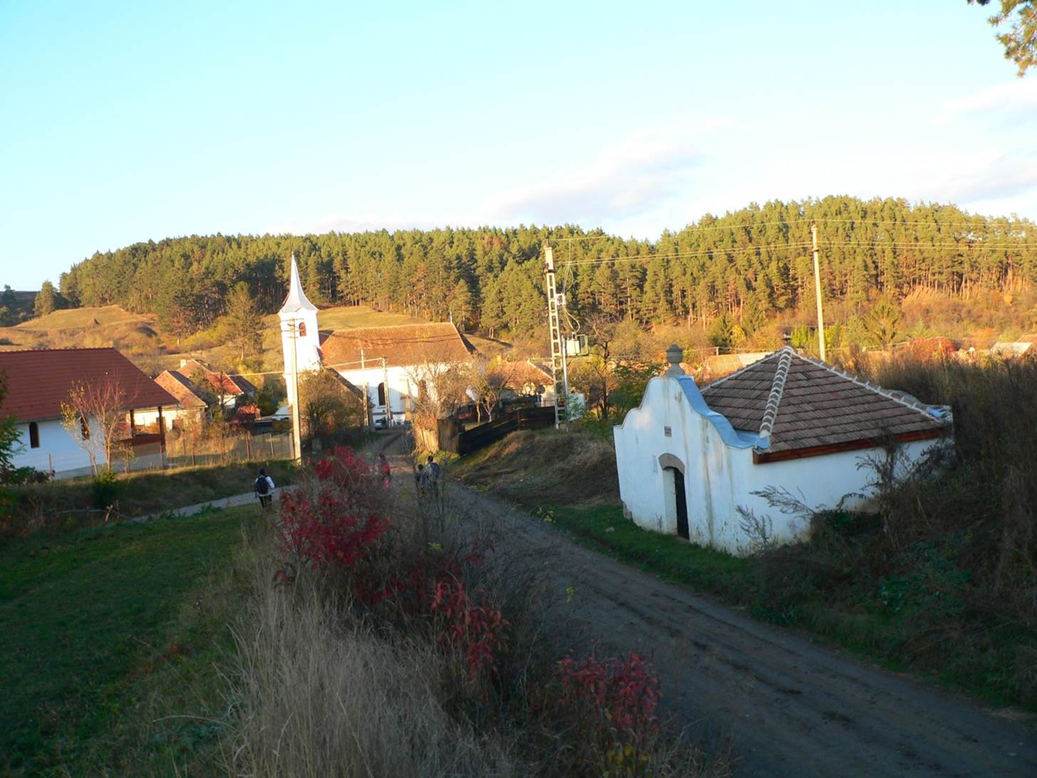 Coborâm spre sat pe un drum de căruțe ce traversează păduricea care acoperă capătul piciorului.