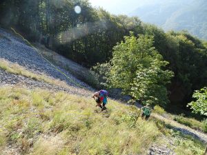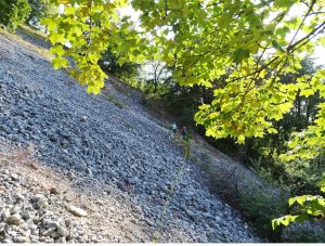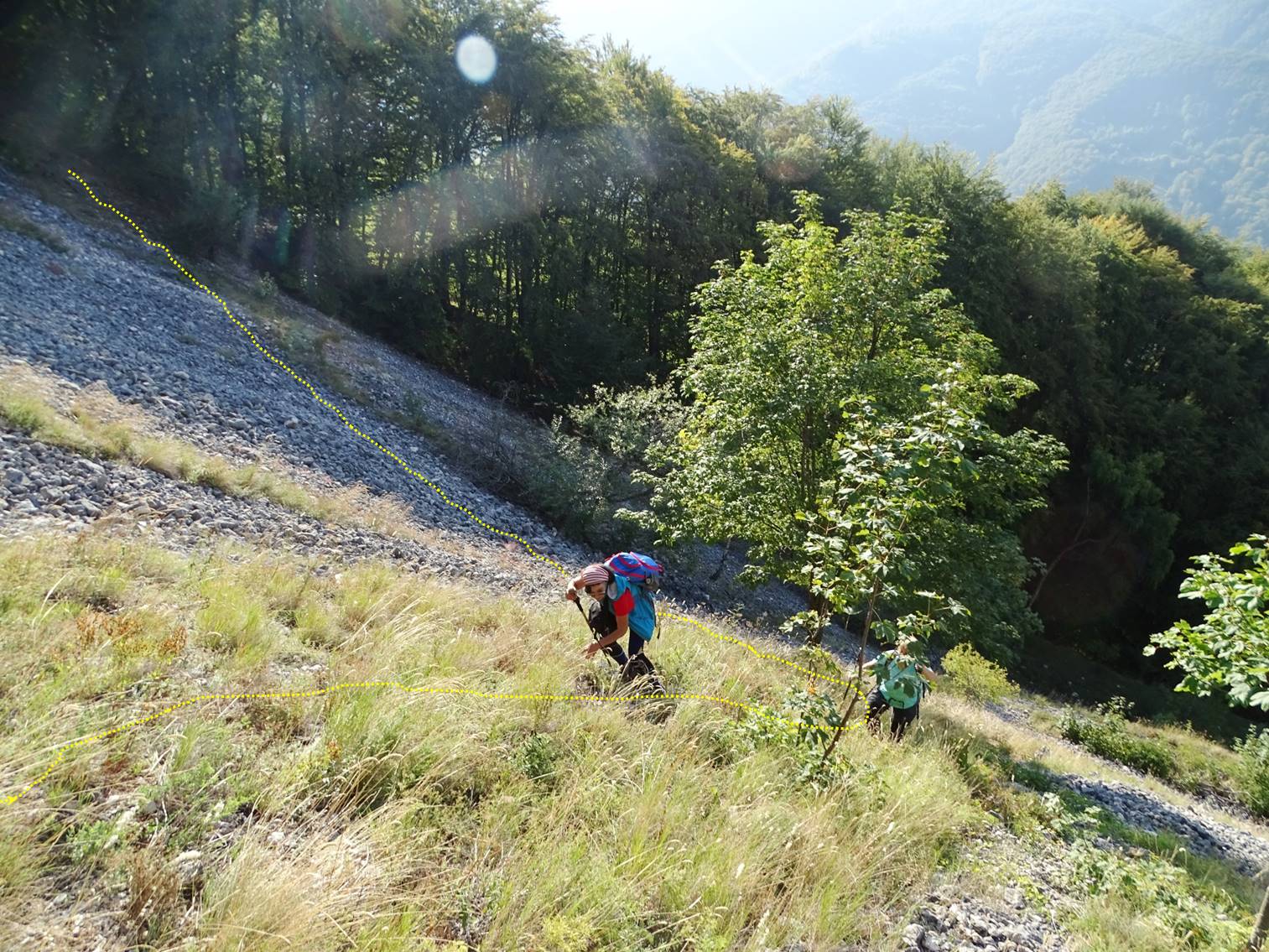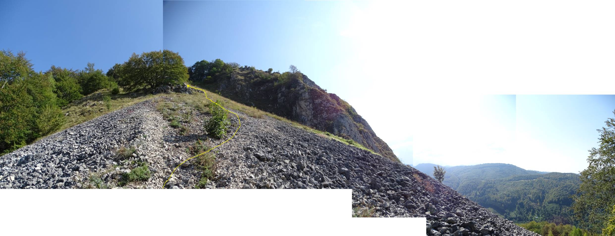 Poteca marcată suie direct prin grohotișul relativ stabilizat și pe o pantă destul de abruptă; e chiar linia de maximă pantă !
