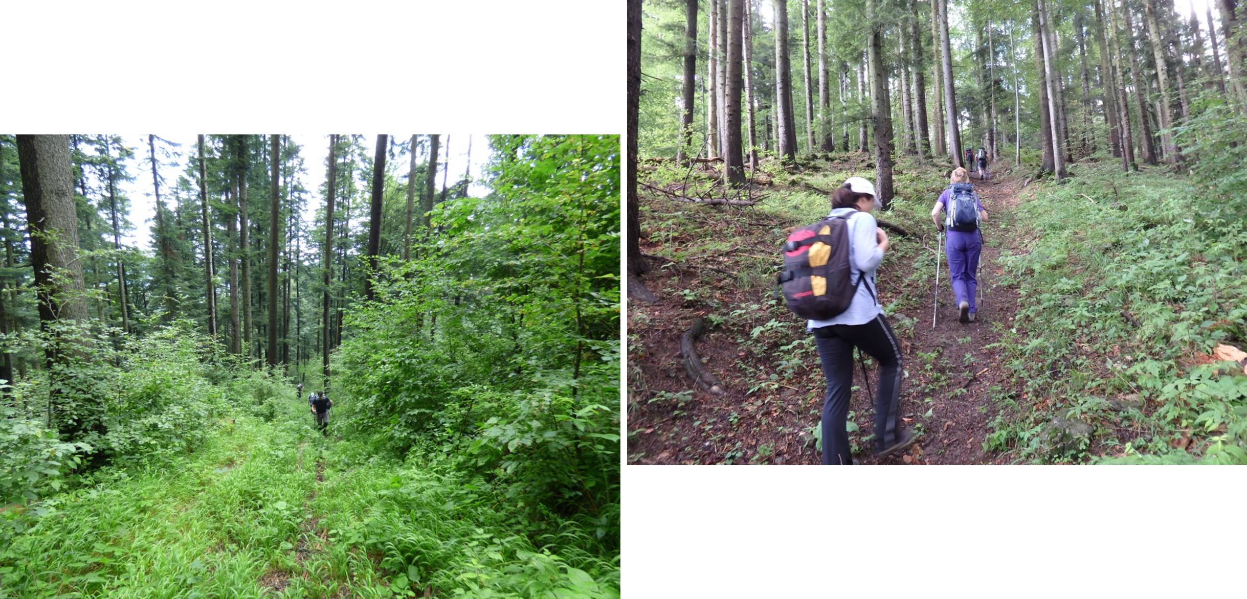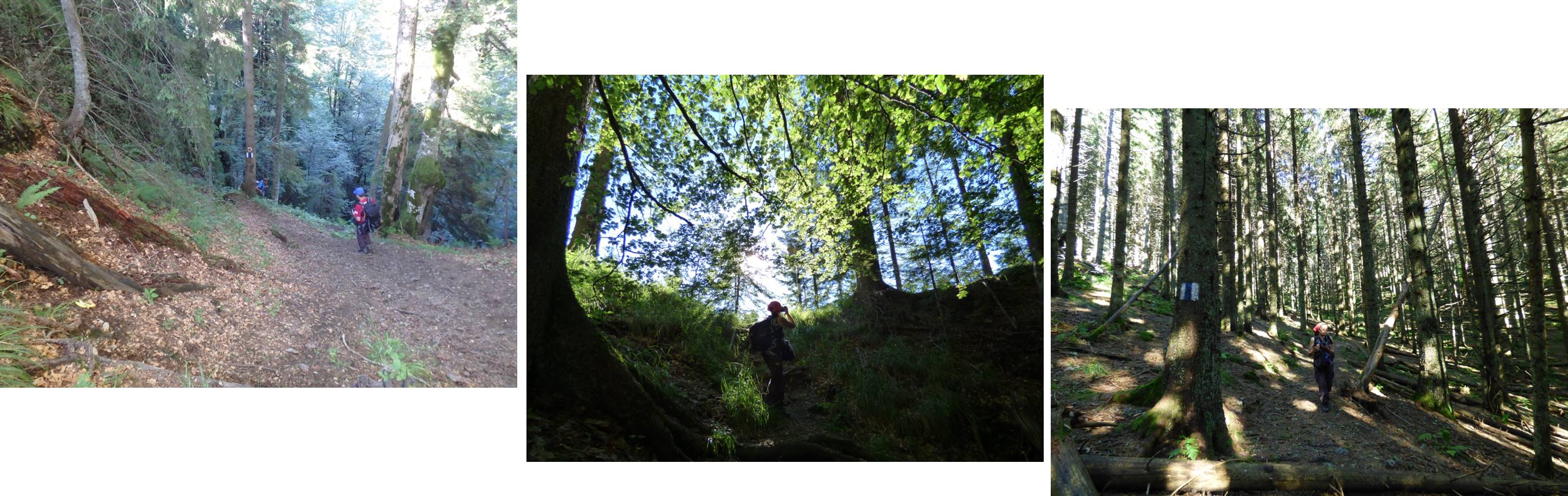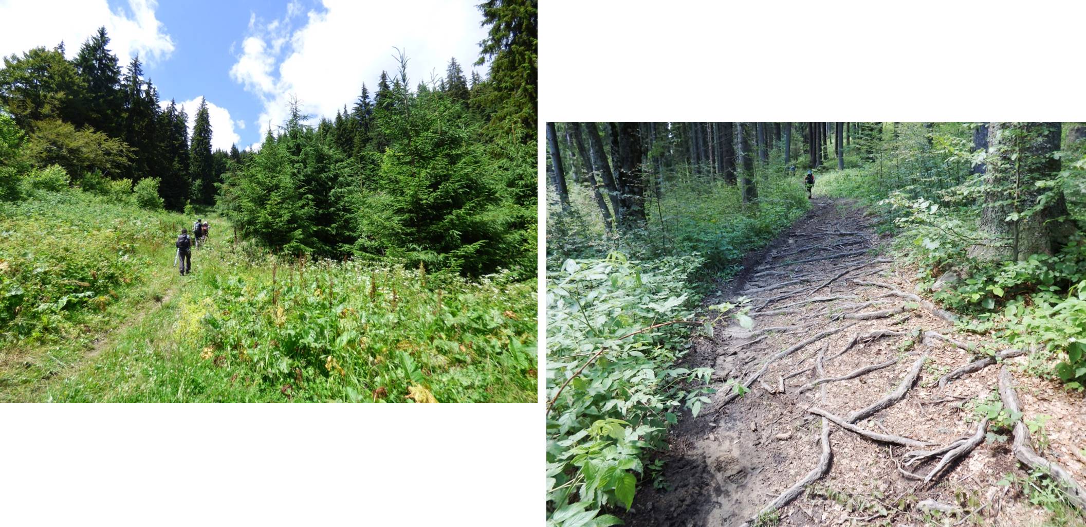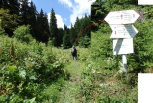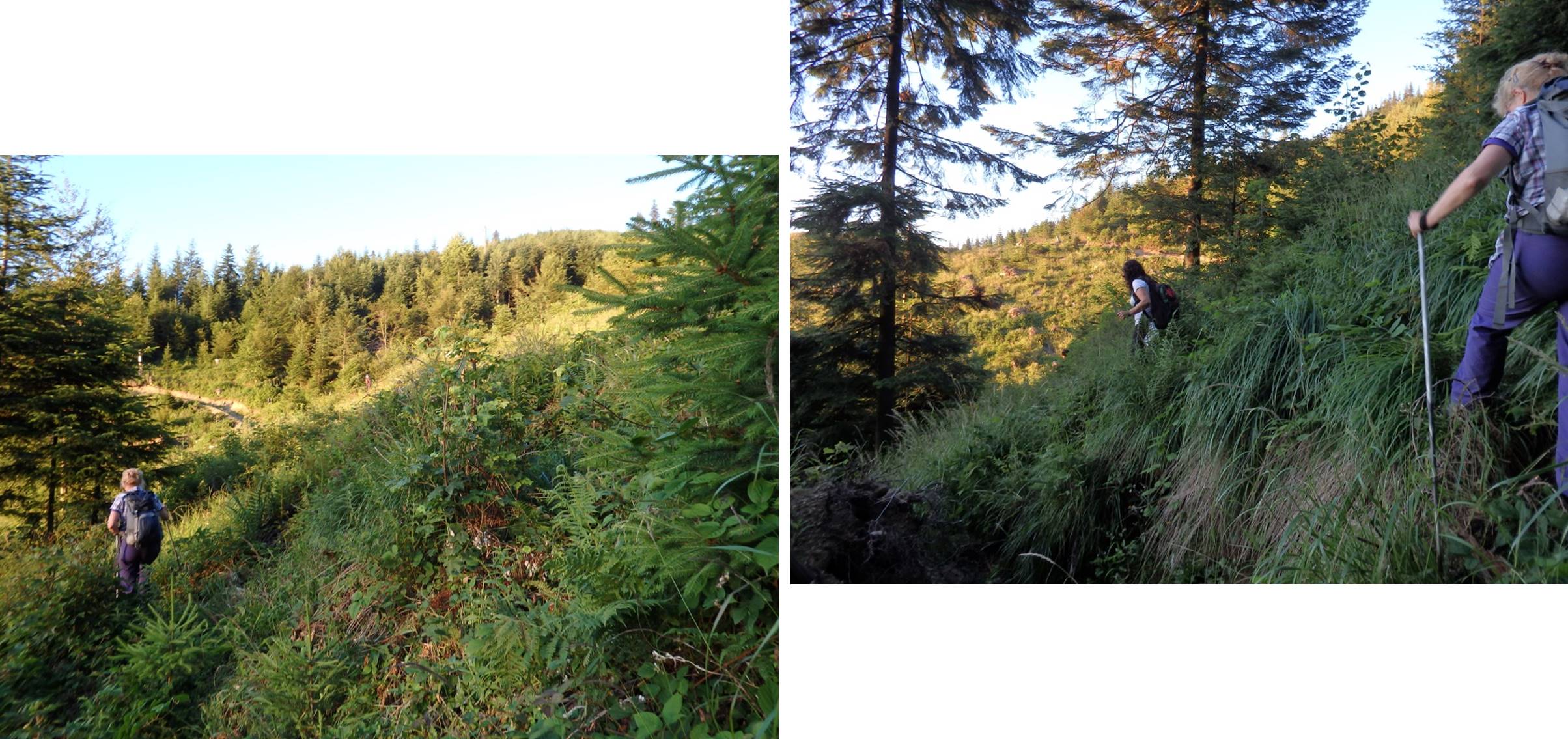 Urmele unui vechi drum de tractor ne conduc puțin în dreapta șeii unde întâlnim un vechi stâlp de marcaj; apoi încă unul, și încă unul și cărarea încă decelabilă prin încâlcitura de căzături, …