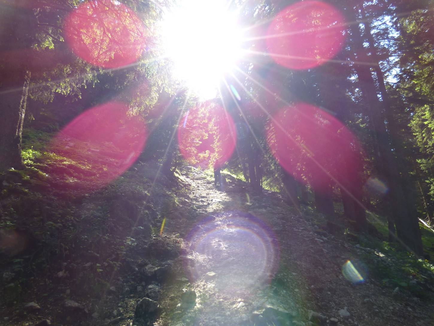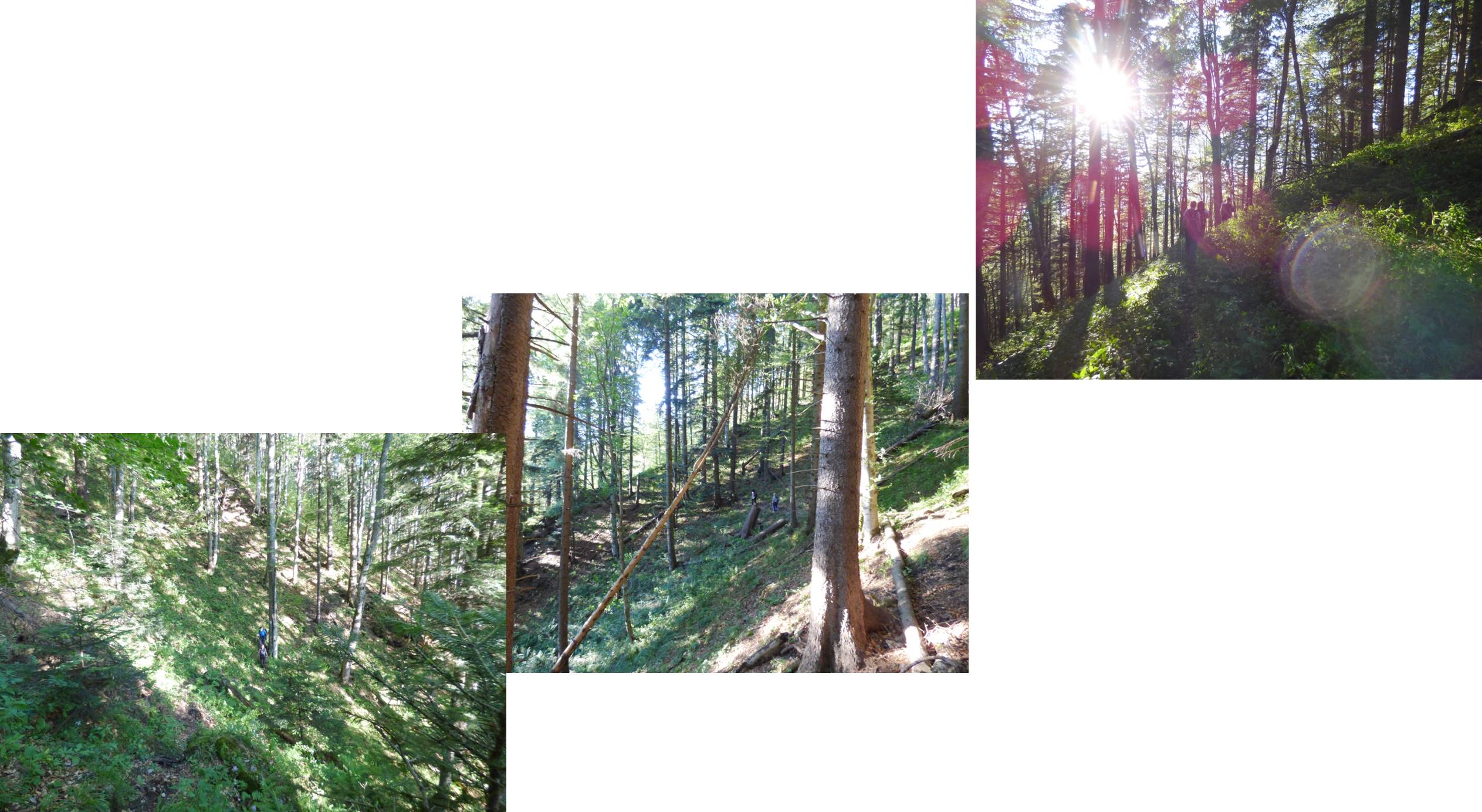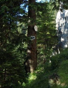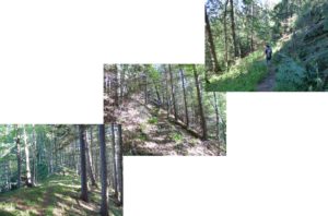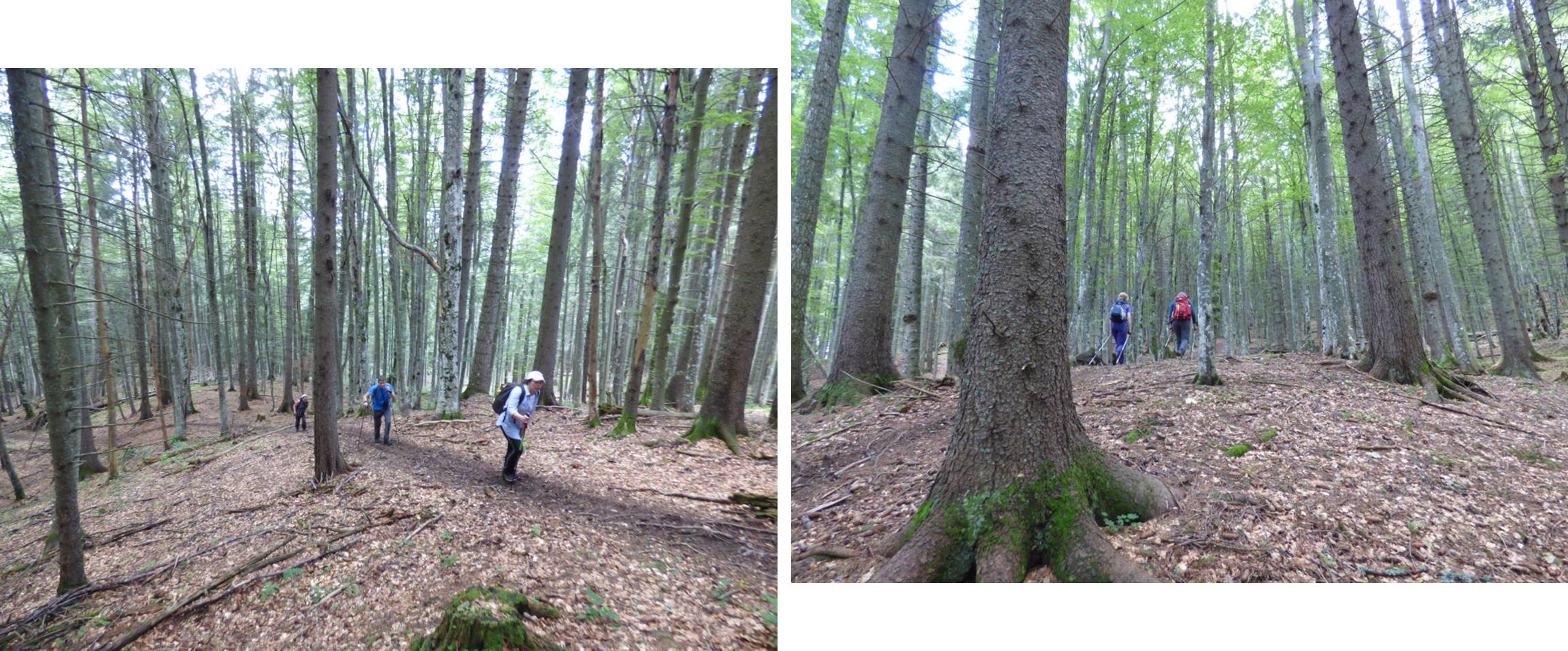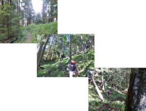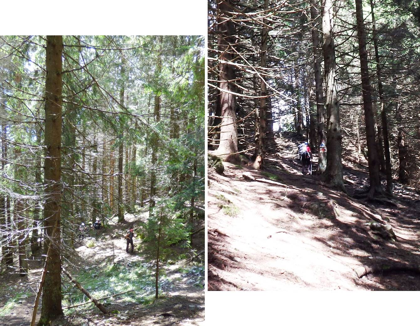 Urmele unui vechi drum de tractor ne conduc puțin în dreapta șeii unde întâlnim un vechi stâlp de marcaj; apoi încă unul, și încă unul și cărarea încă decelabilă prin încâlcitura de căzături, …